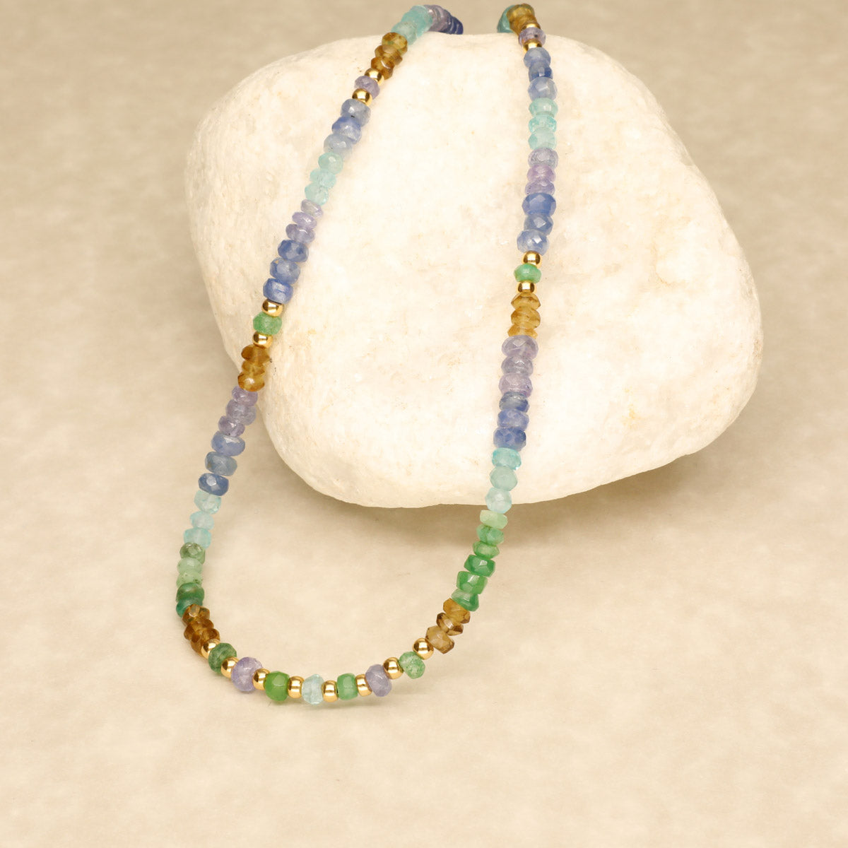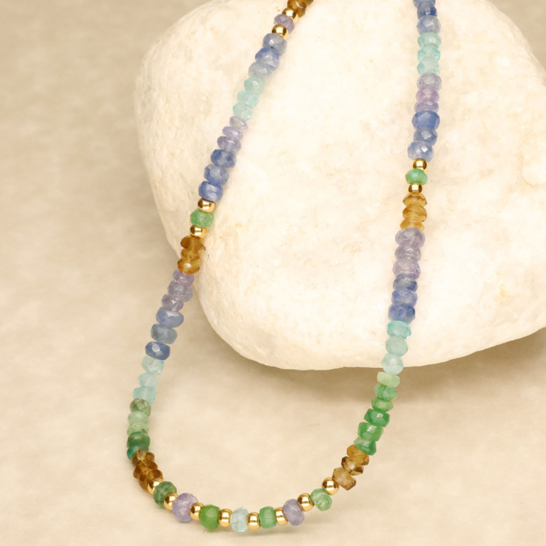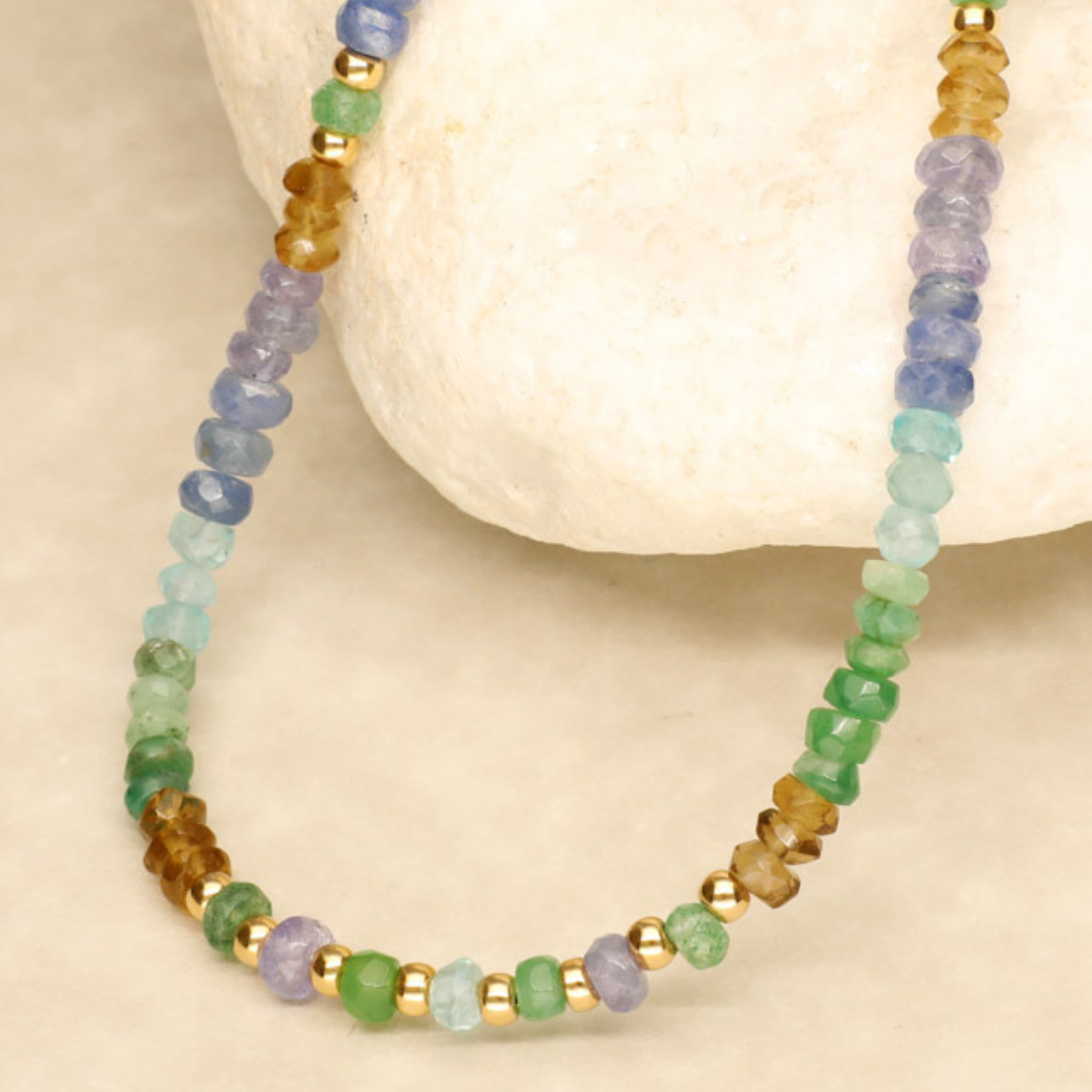 Delicate blends of purple, brown and green combine to create an unexpected yet harmonious palette which come together in a magical mix that will suit any skin tone.. Wear with your little black dress, or more casually with a crisp white or sporty denim shirt to make this mix pop. Perfect to wear alone or layer up with your favourite gold or silver necklace stack. Hand selected semi precious stones highlight the intrinsic beauty of nature to create a stunning piece you will fall in love with. As modern as it is sophisticated.