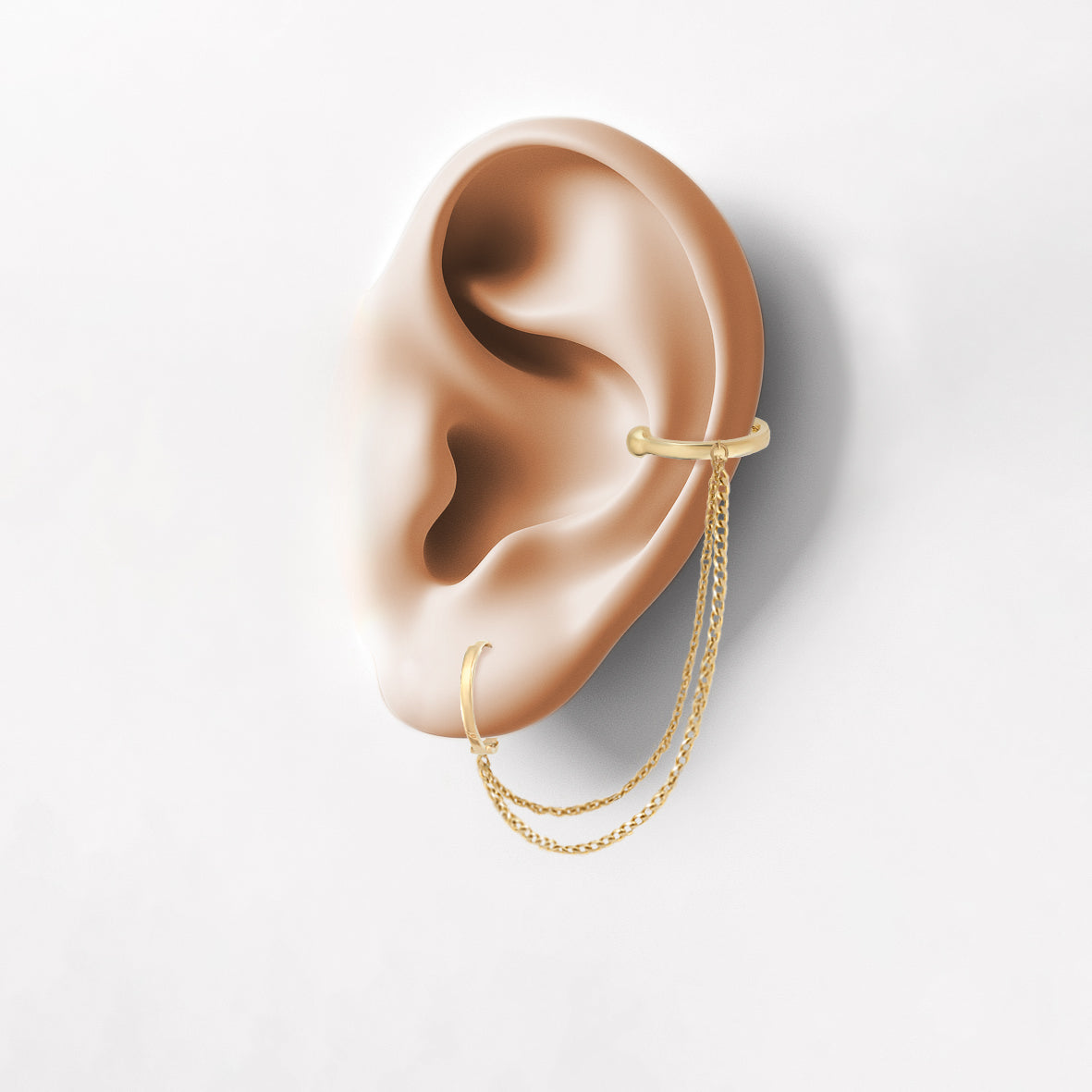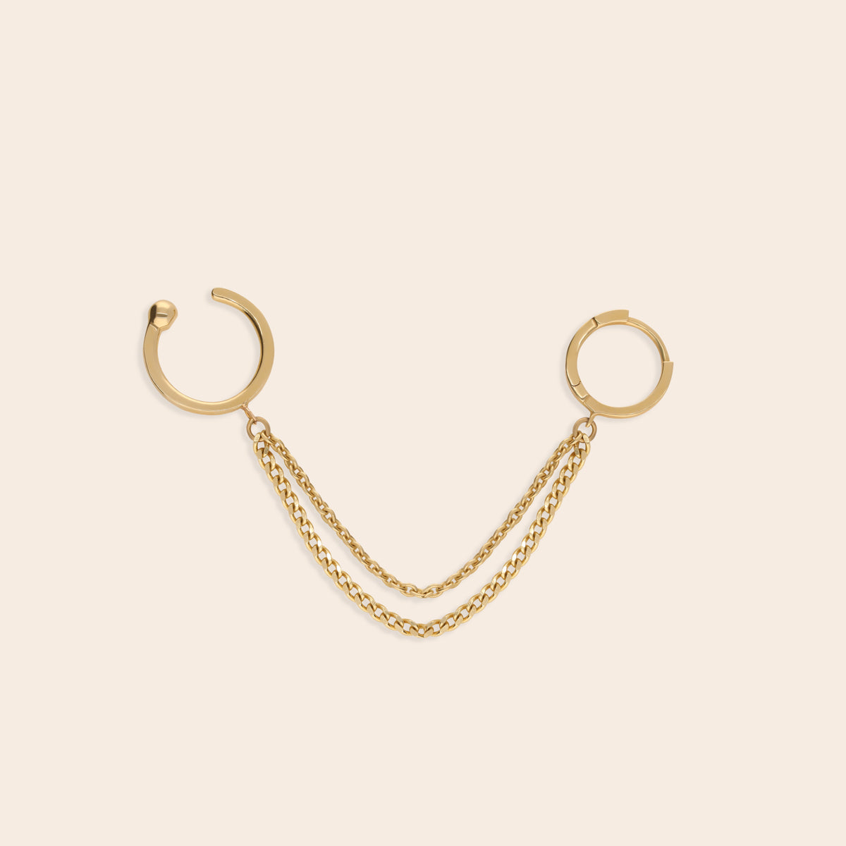 This style is designed to turn heads. With a long double chain connecting a classic ear hoop to a clean and contemporary ear cuff (no piercing needed) your single lobe piercing will take on a modern and fresh vibe