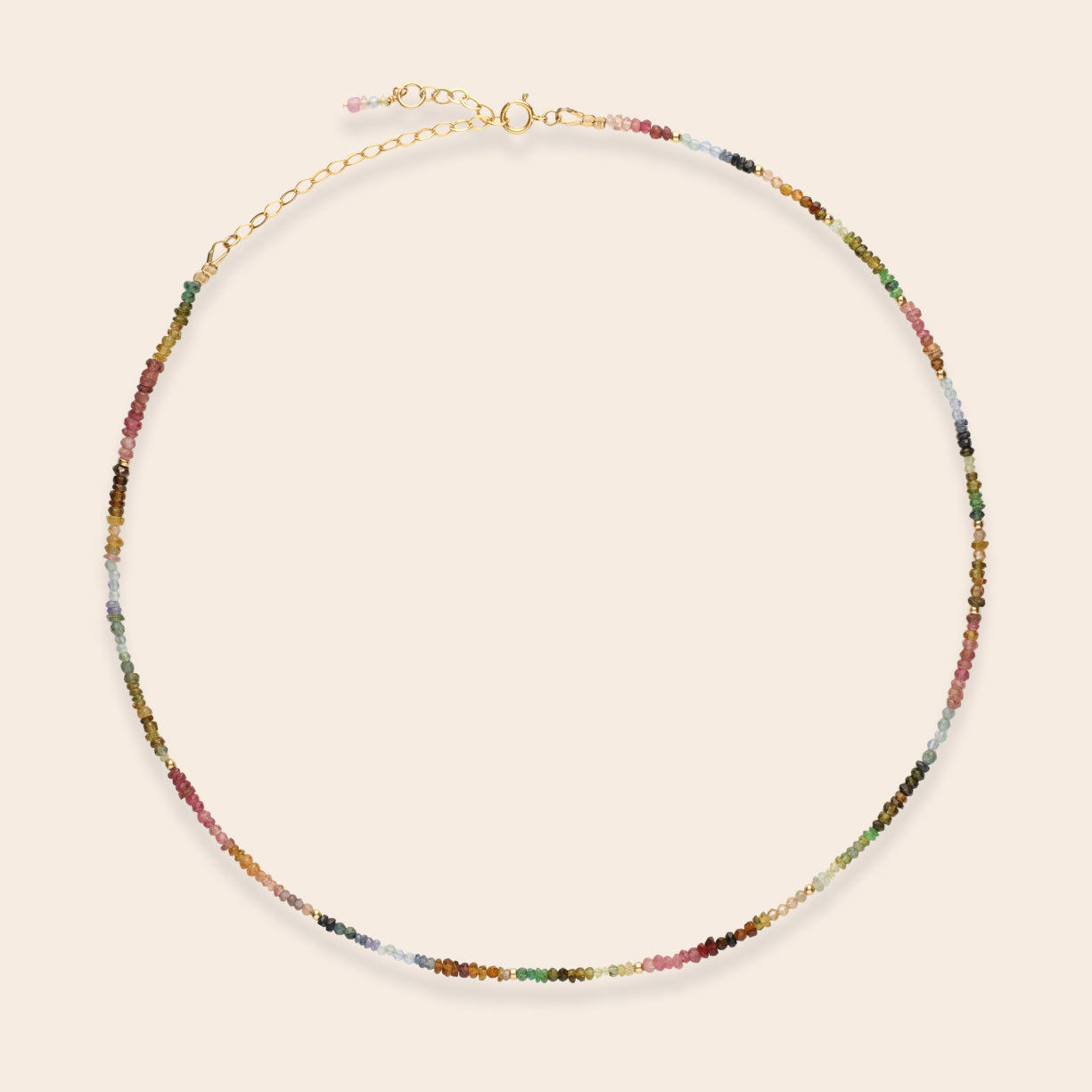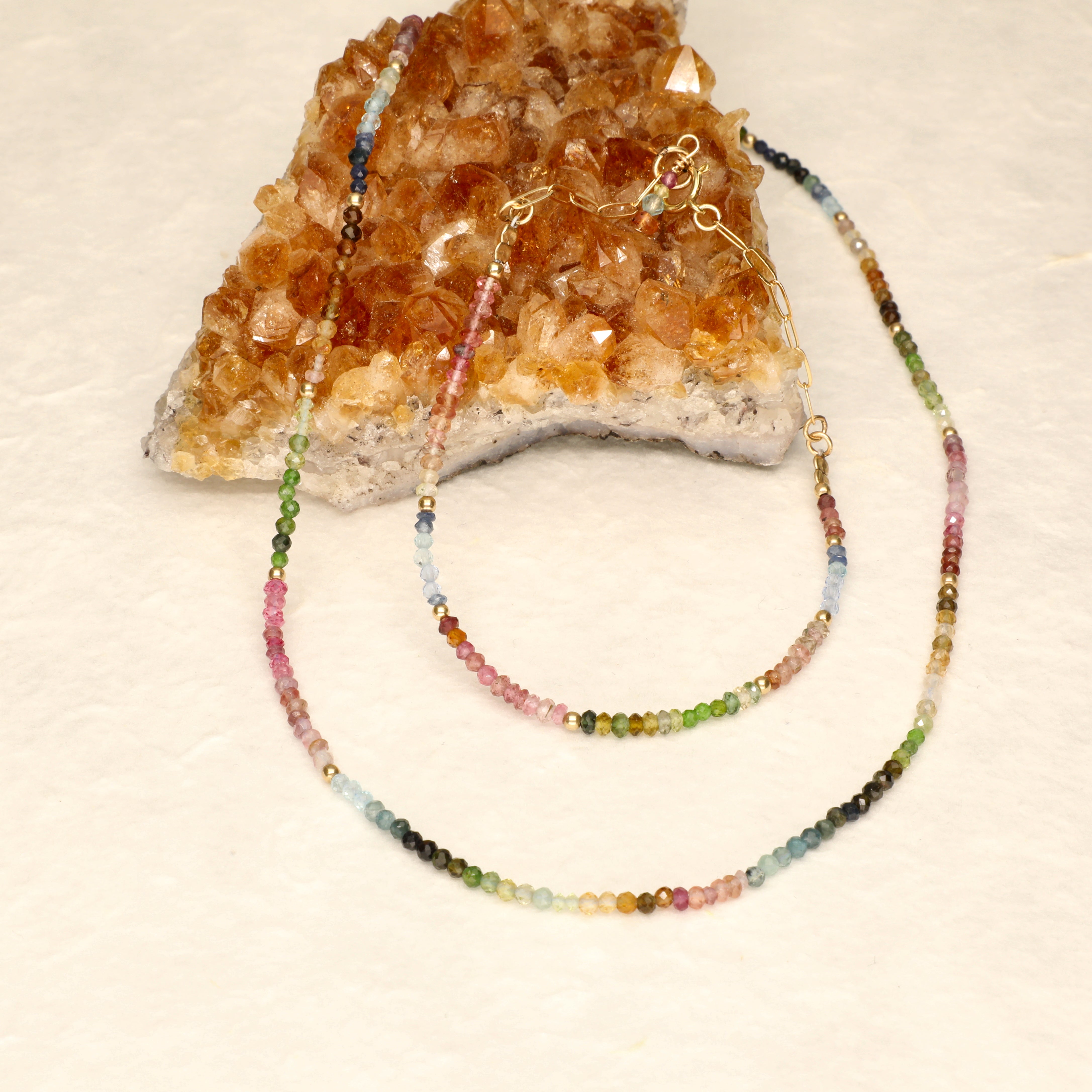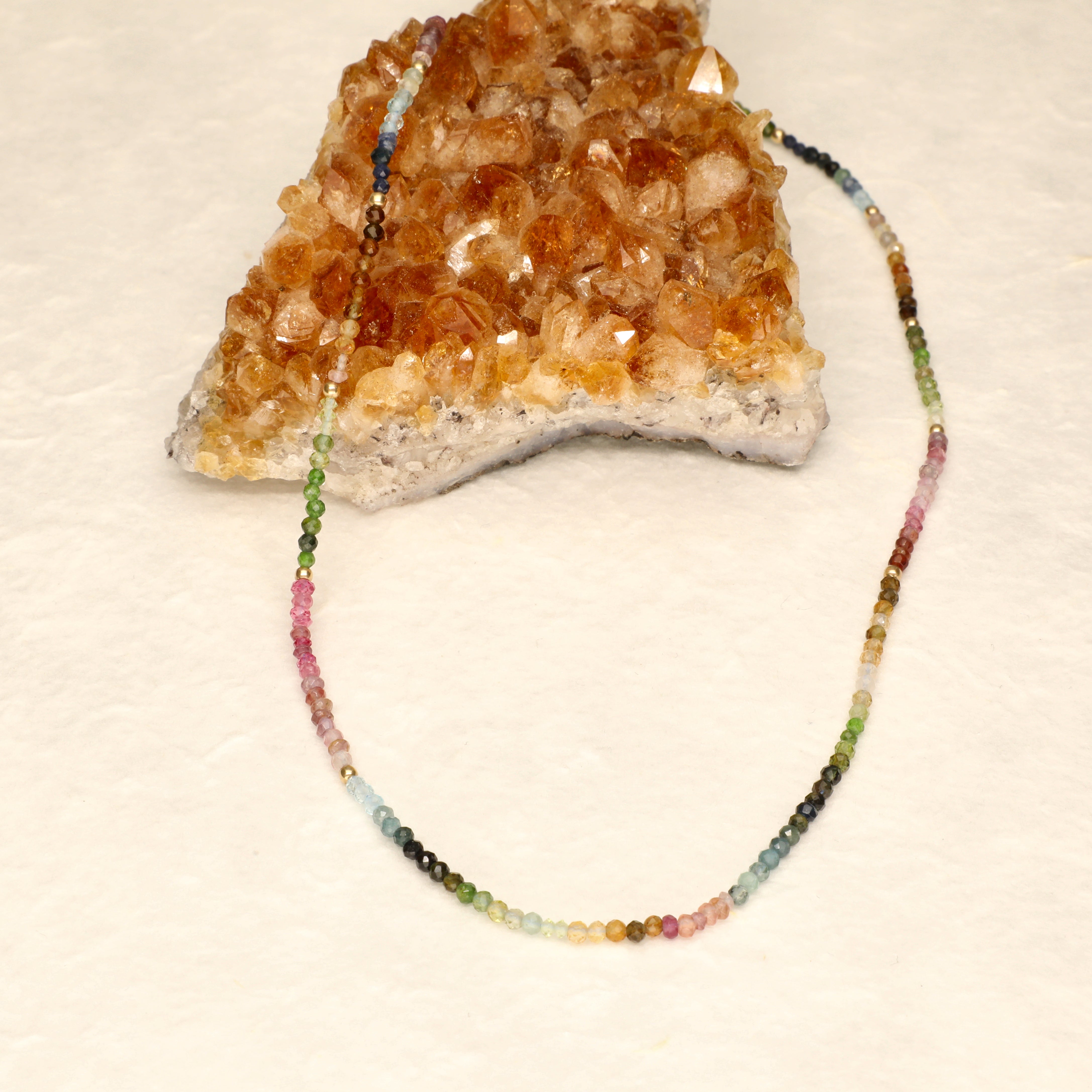 Rich jewel tones of aquamarine tsavorite brown and pink tourmaline and sapphire delicately arranged in ombre rainbow palettes create a sophisticated and feminine layering necklace. Perfect to wear alone or layer up with your favourite gold or silver necklace stack. Hand selected semi precious stones highlight the intrinsic beauty of nature to create a stunning piece you will fall in love with. As modern as it is sophisticated.