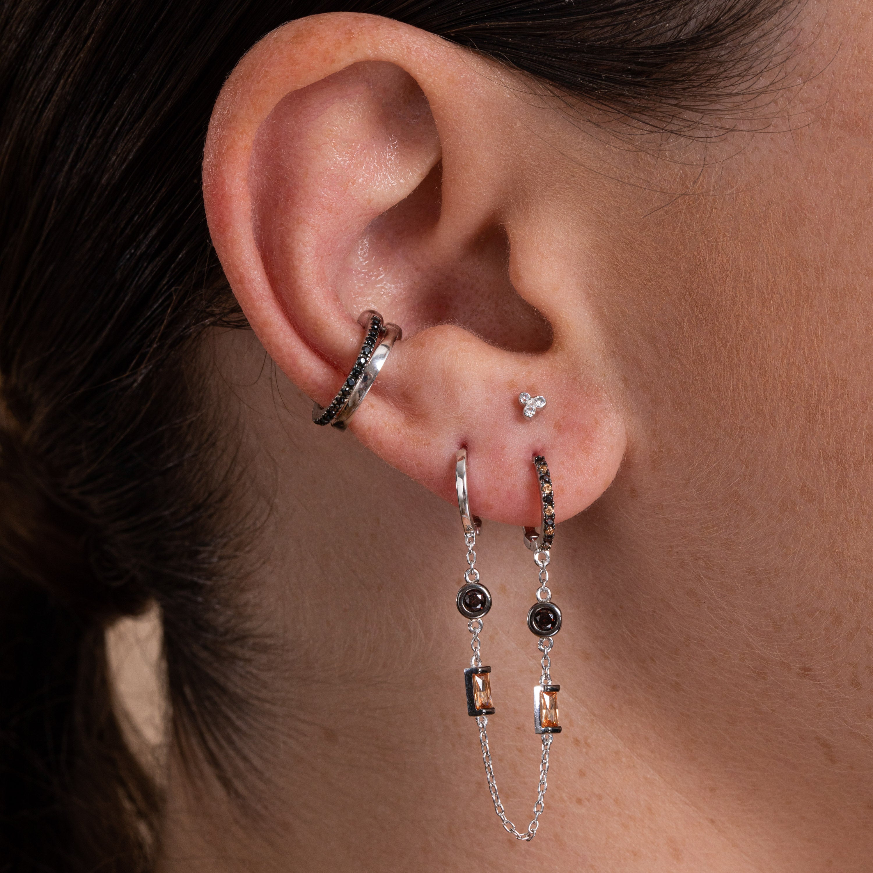 This double piercing earring is a new addition to the range. Ideal for 2 side by side lobe piercings, this style is easy to wear and will work with any look. Casual with just the right amount of bling, we just love the way this look works for any occasion