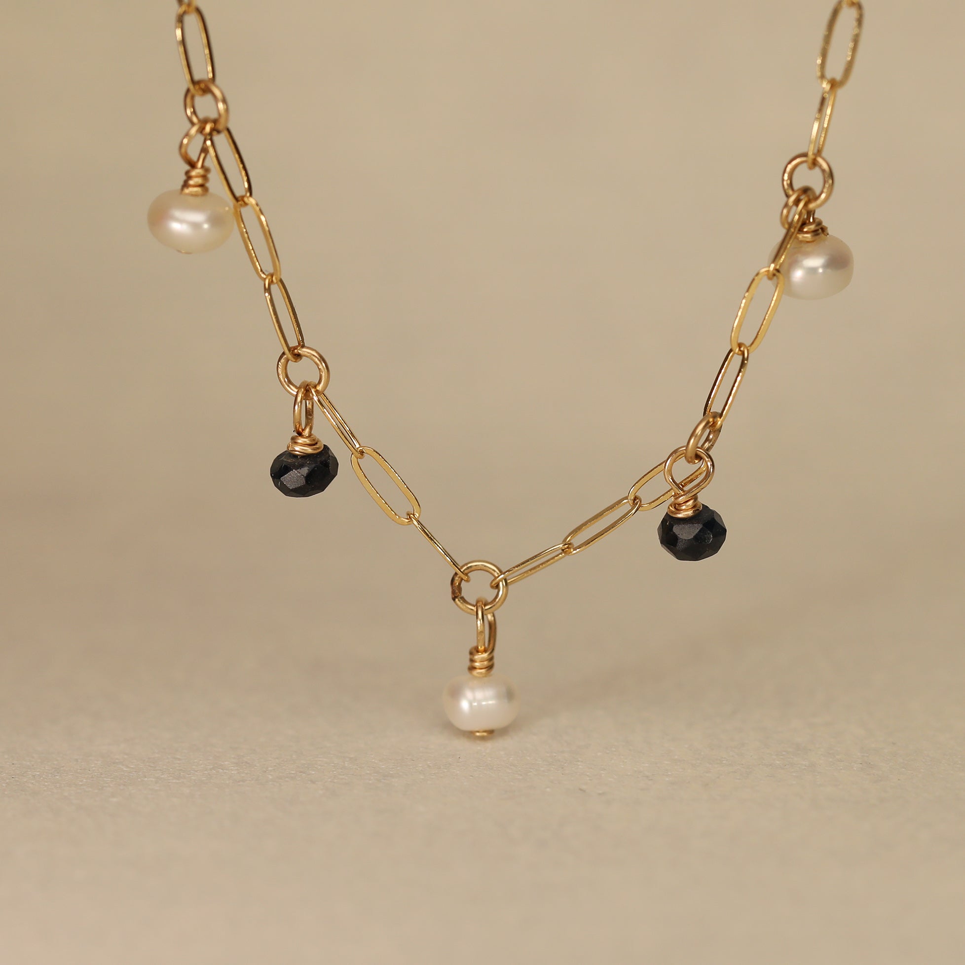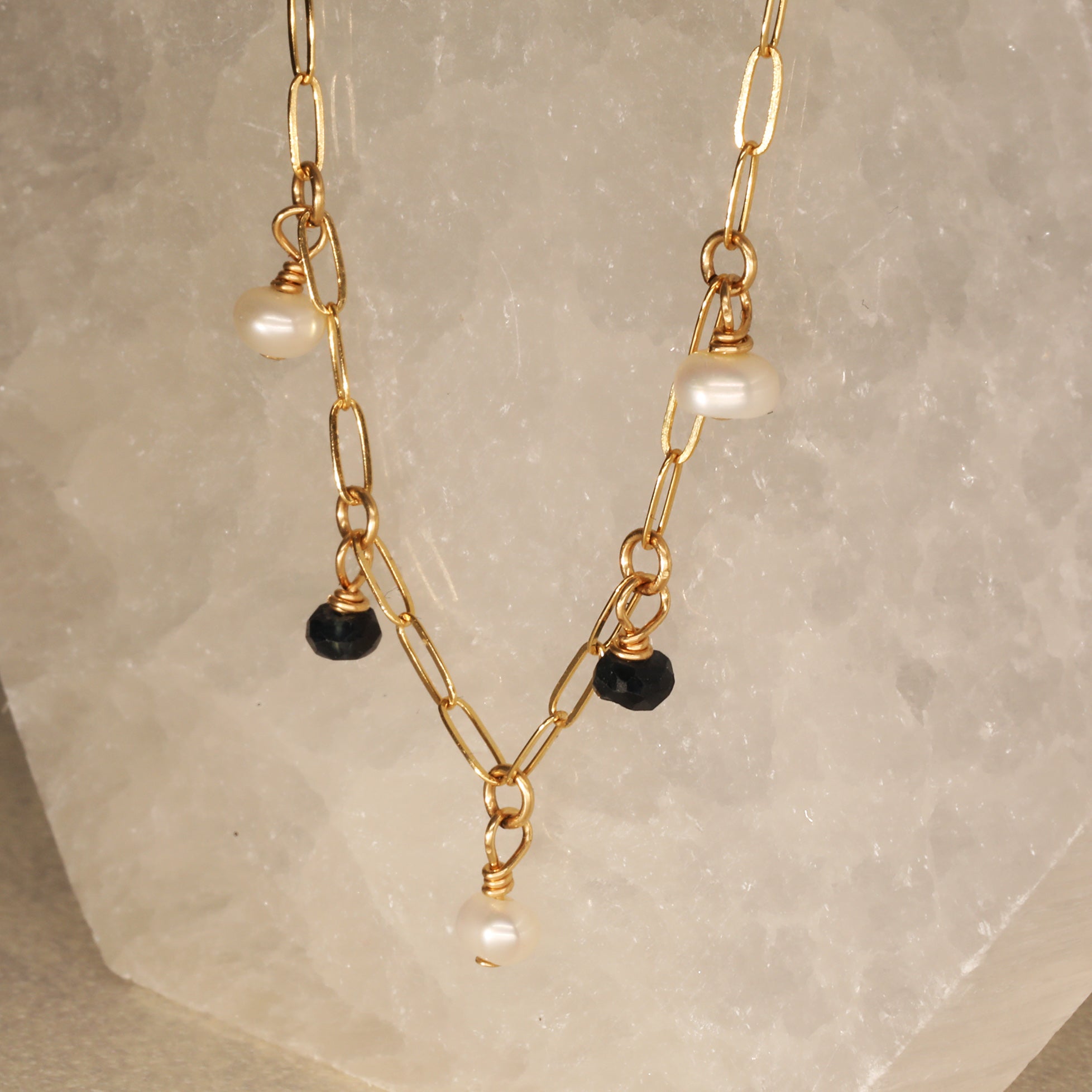 This chunky yet feminine anklet features all the beauty of natural semi precious stone and pearl detailing on a gold filled hairpin chain. With a slightly boho vibe this style will sit comfortably on the ankle adding just the right amount of color and sparkle.