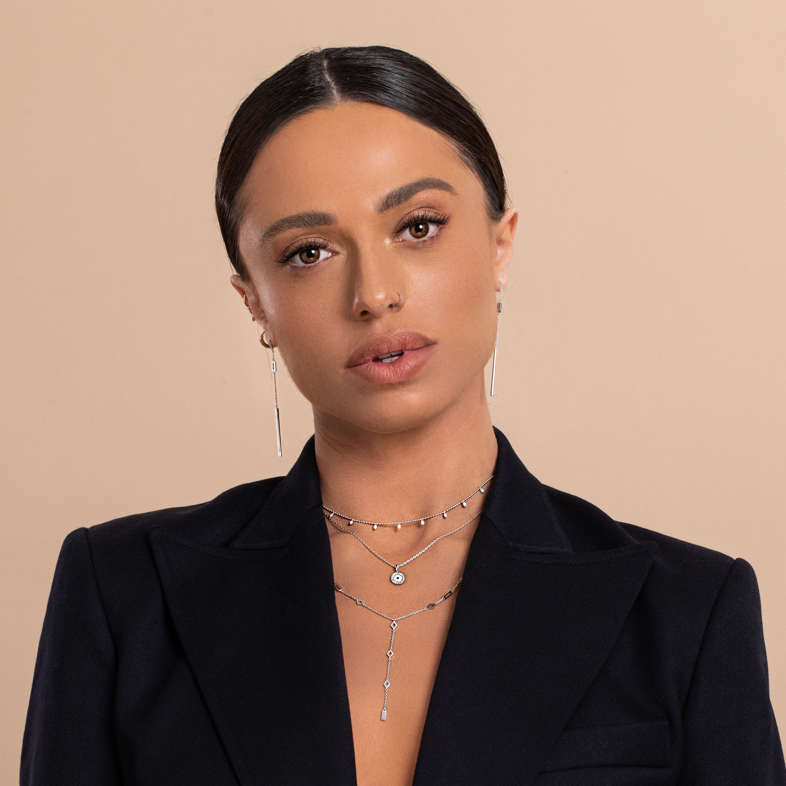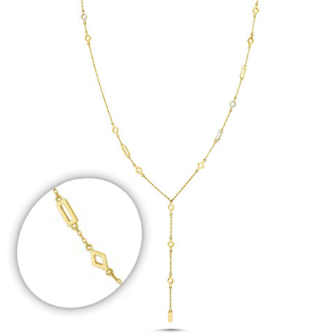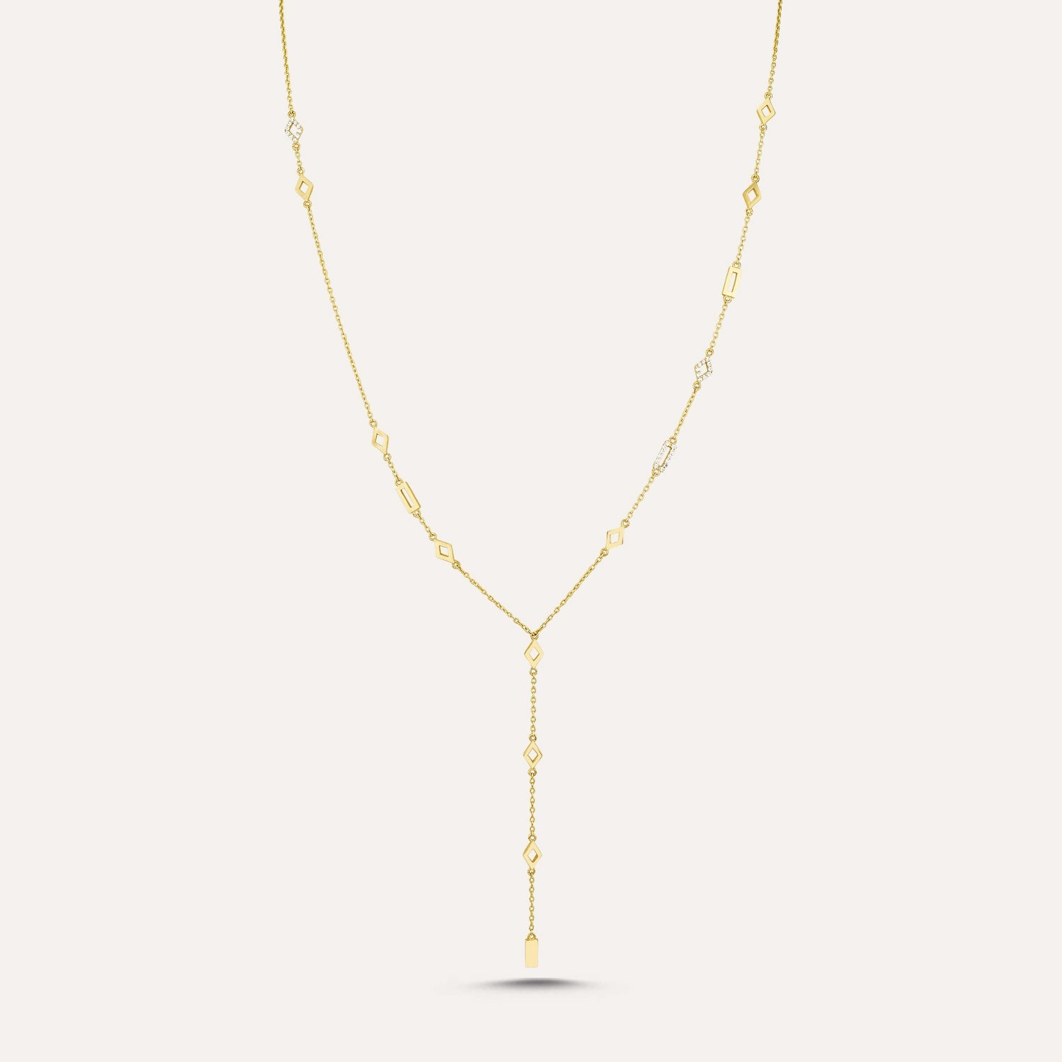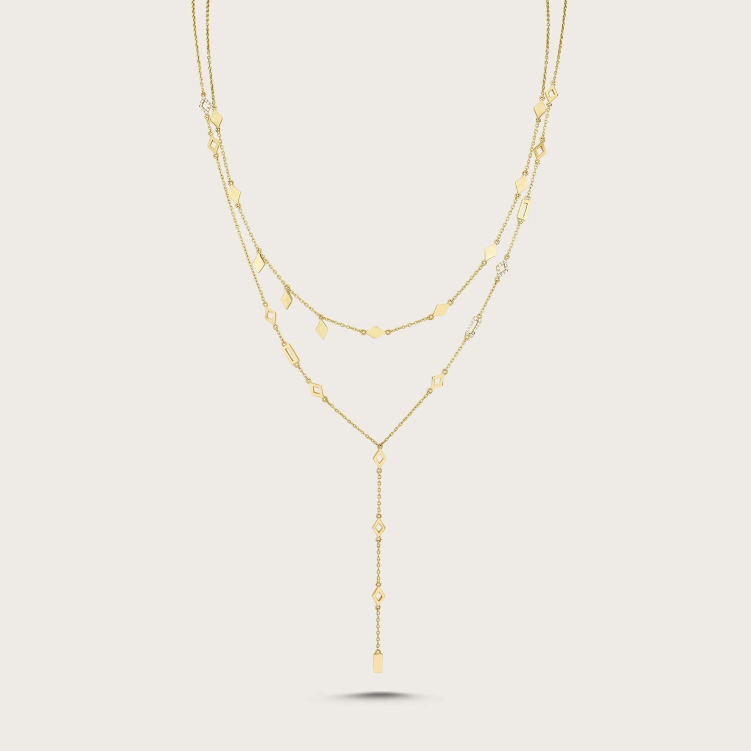 Featuring a mix of highly polished plain and pave stone embellished geometric shapes, this lariette is one of the cornerstone pieces of the collection. Sleek clean lines and elegantly crafted detail come together to create a look and style that is truly breathtaking. Wear alone or layer it up . With three length adjustments the options for how to wear this piece are limited only by your imagination.
