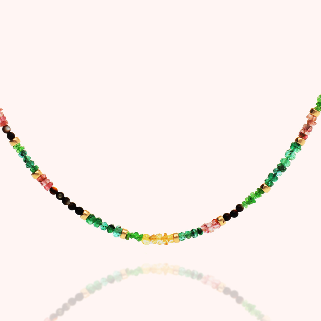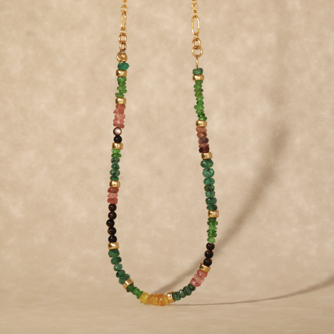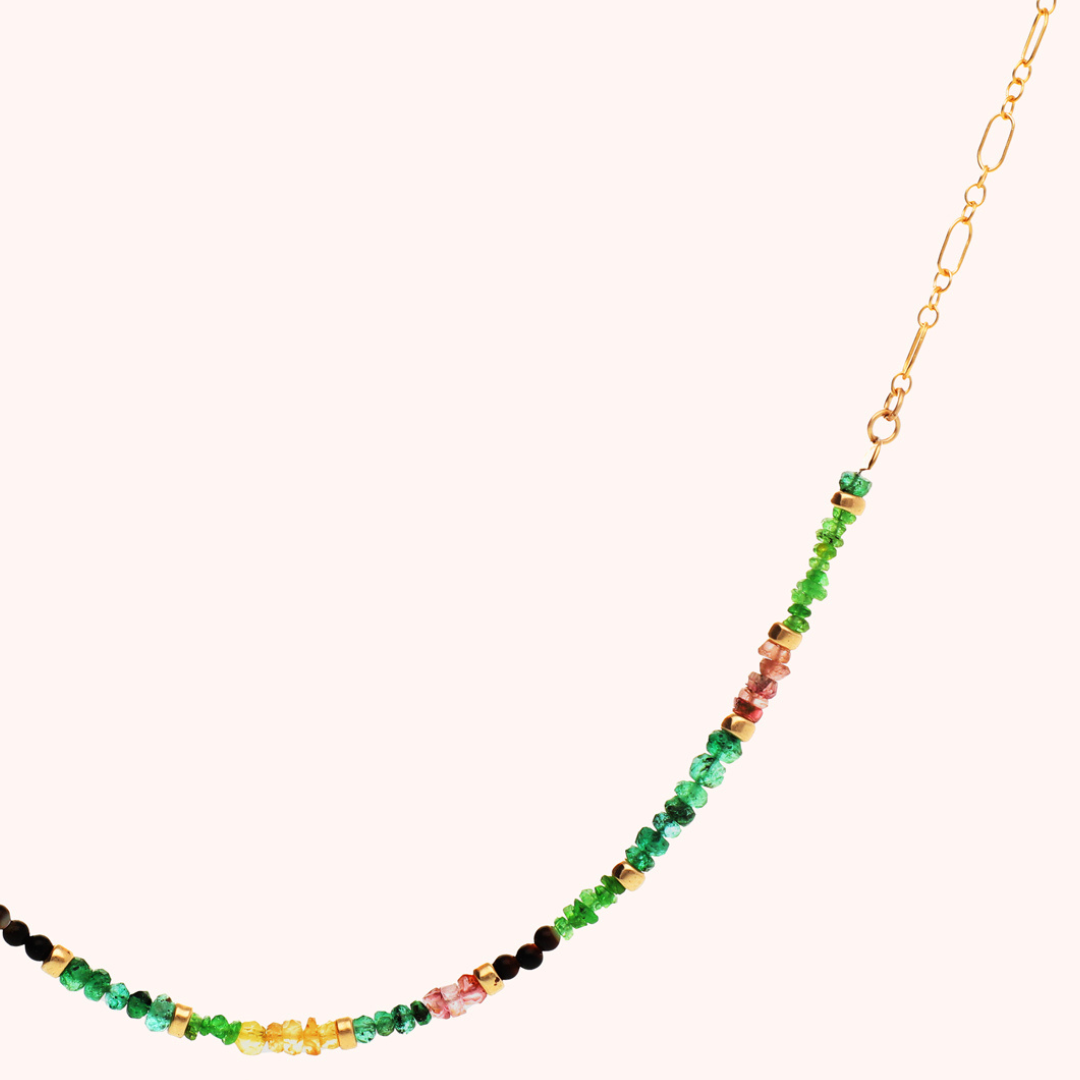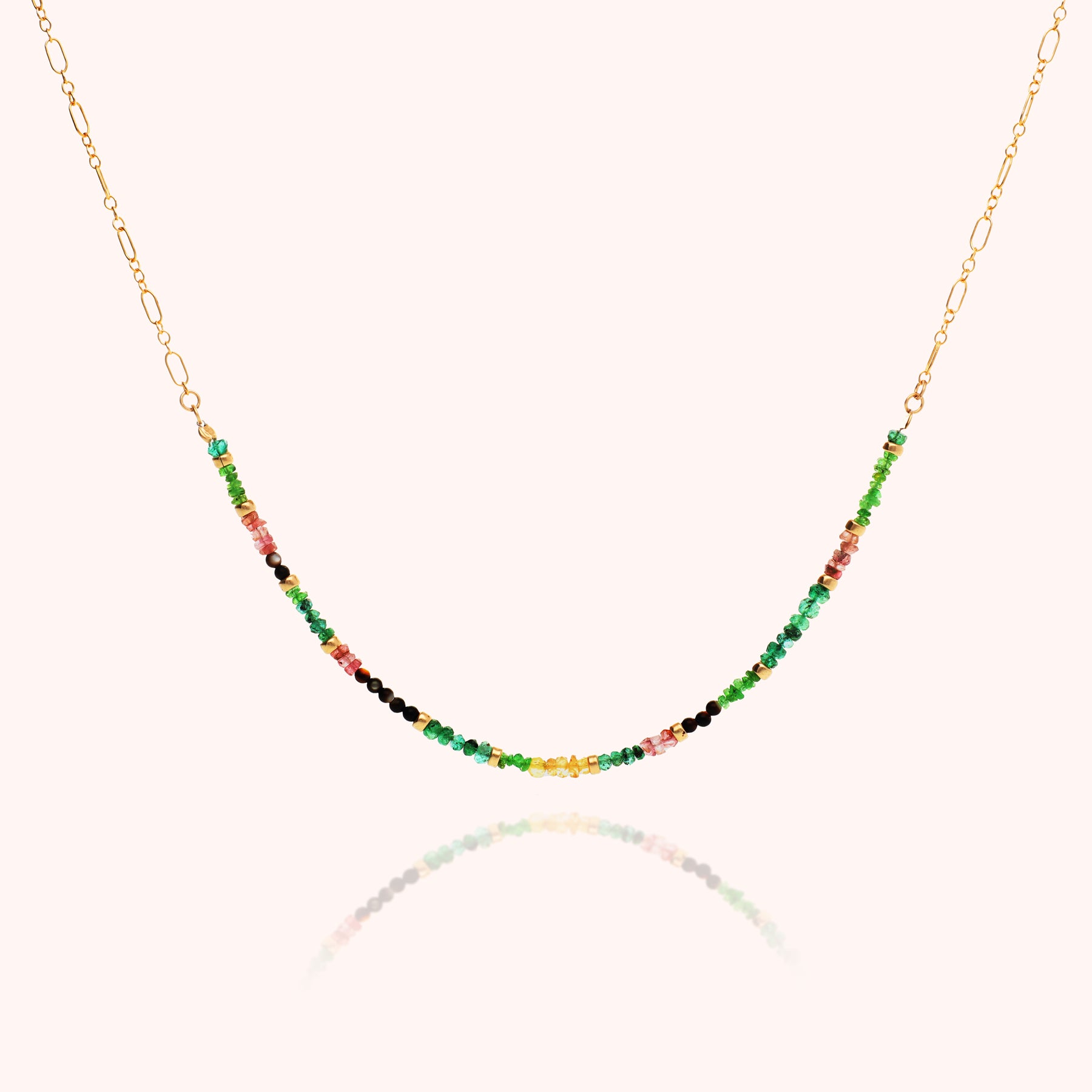 Featuring coloured tourmaline and emerald details this is the perfect piece to add a touch of colour to your stack. With its unique mix of colours this piece will suit all skin tones. Gold filled chain and fastenings provide all the benefits of solid gold without the heavy price tags.