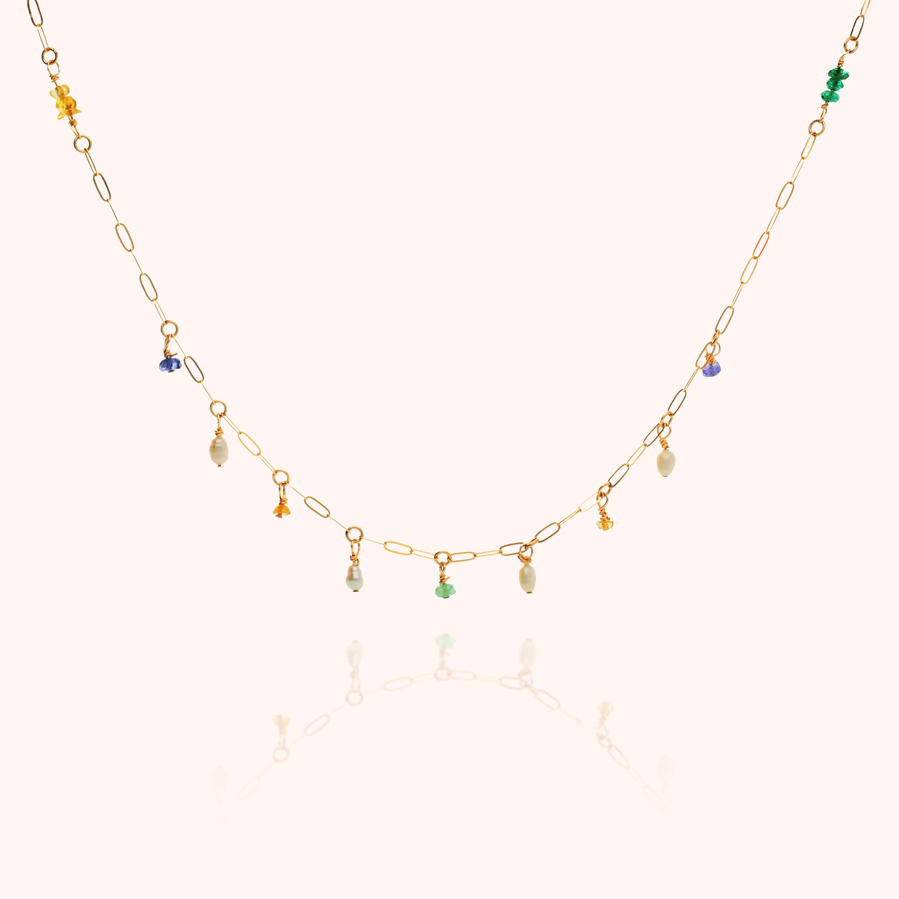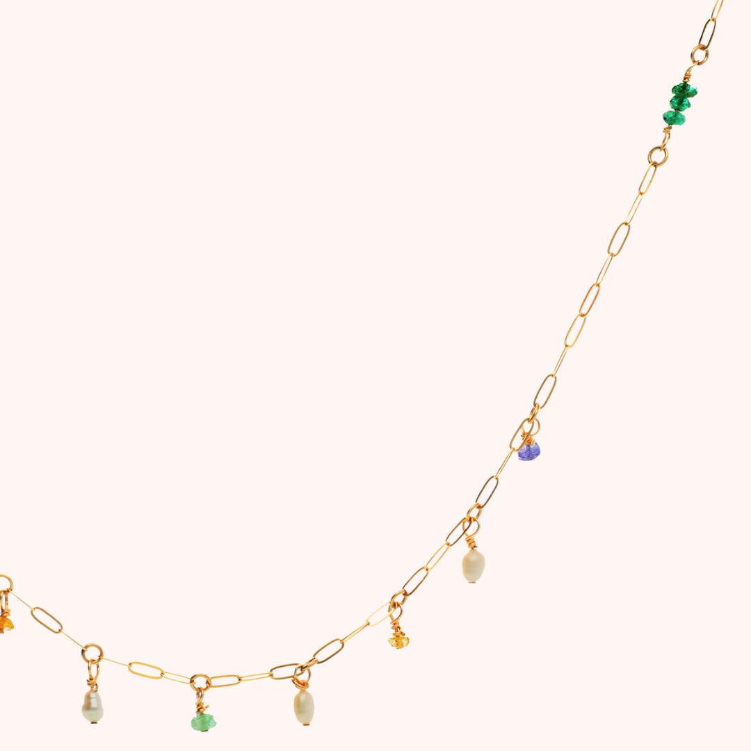 Emerald citrine and tanzanite combine to create this striking rainbow design. The translucency of these stunning natural stones together with gold filled chain detail combine to create a breathtaking necklace that suits any skin tone. Worn alone or as par of a stack this design will add a touch of boho chic to any look