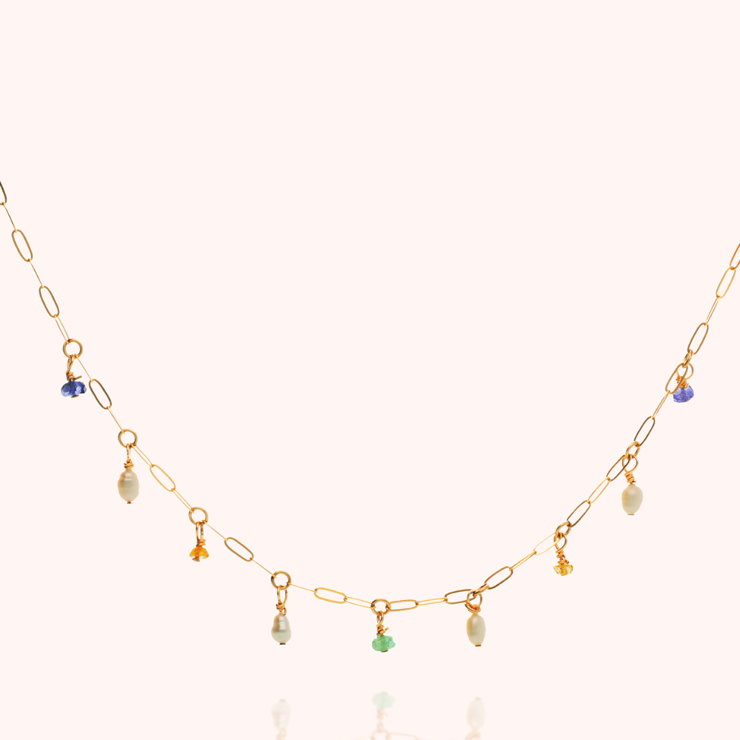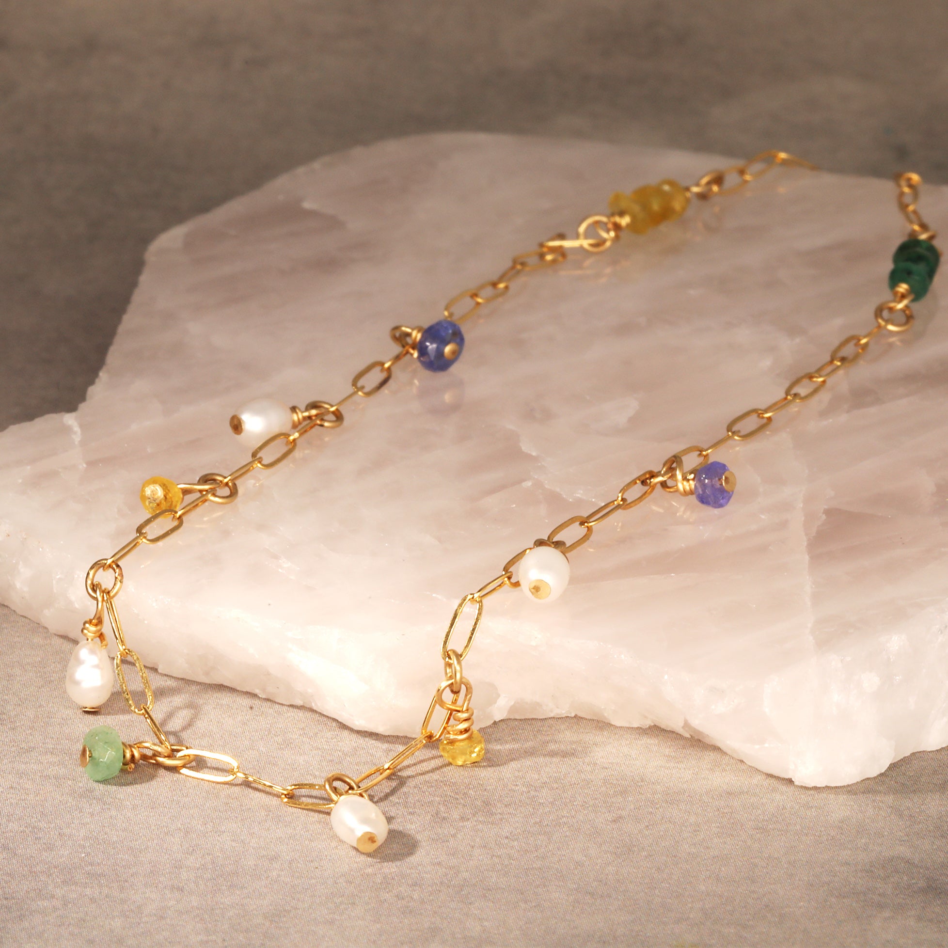 Pearl, Tanzanite and Peridot Hanging Stones Gold Filled Necklace