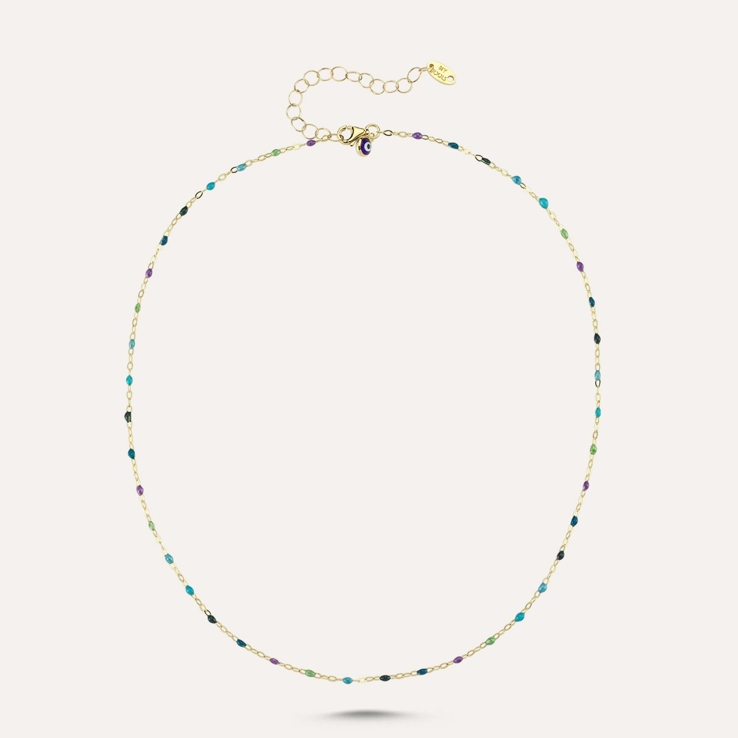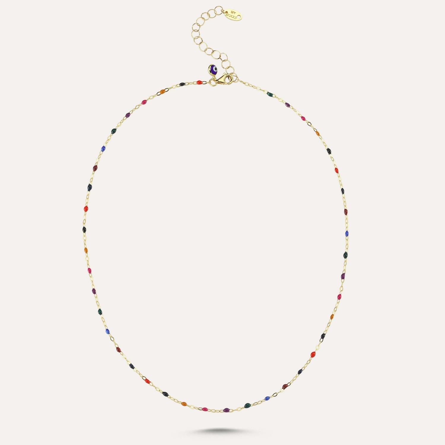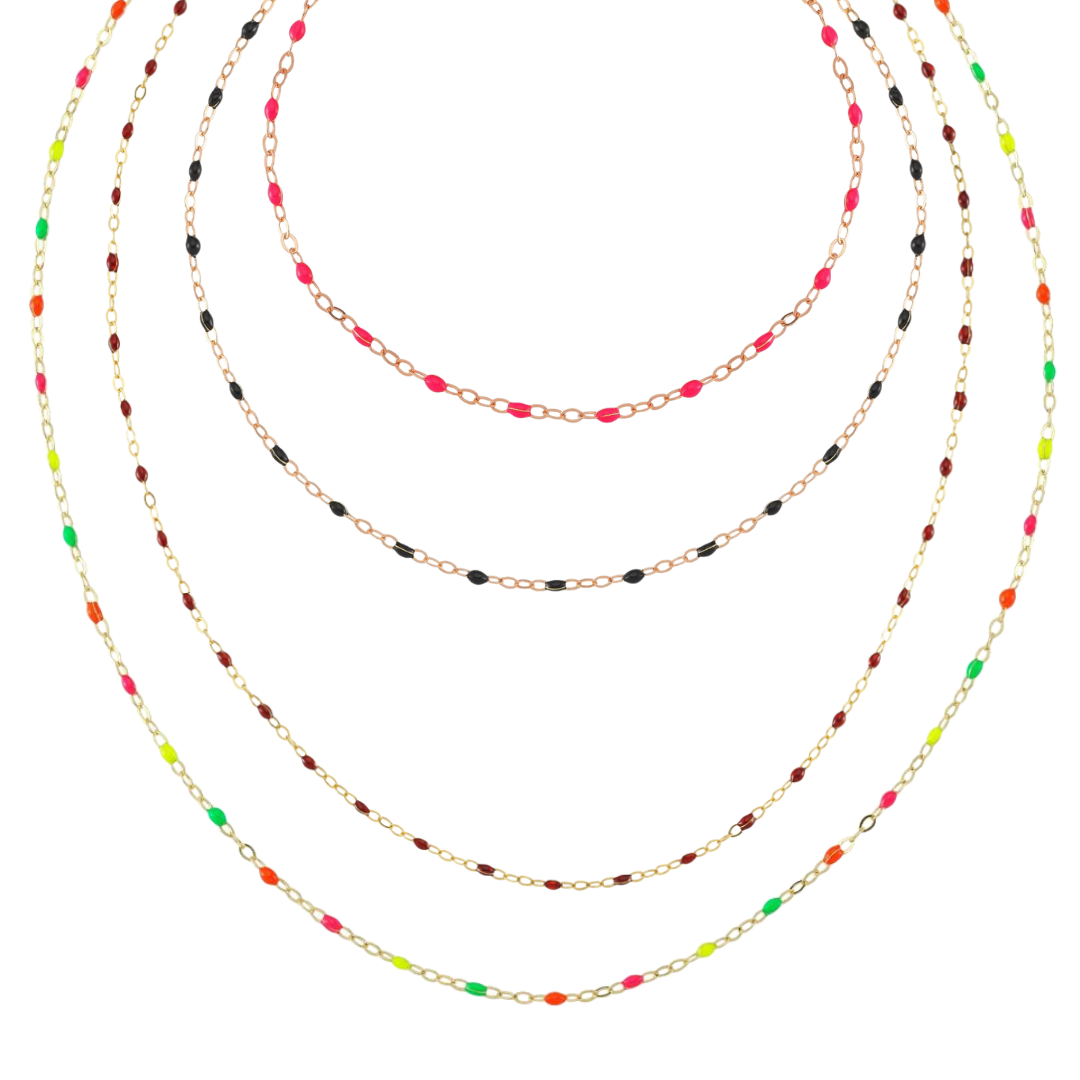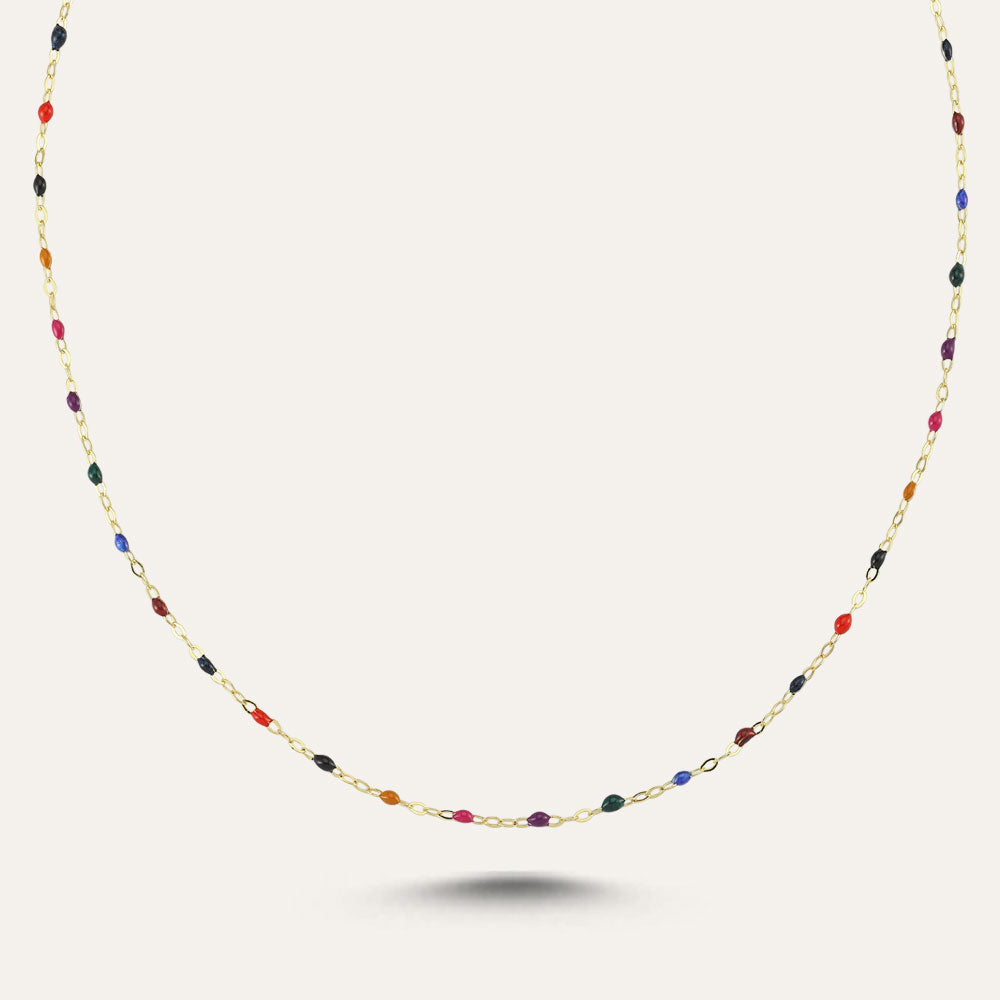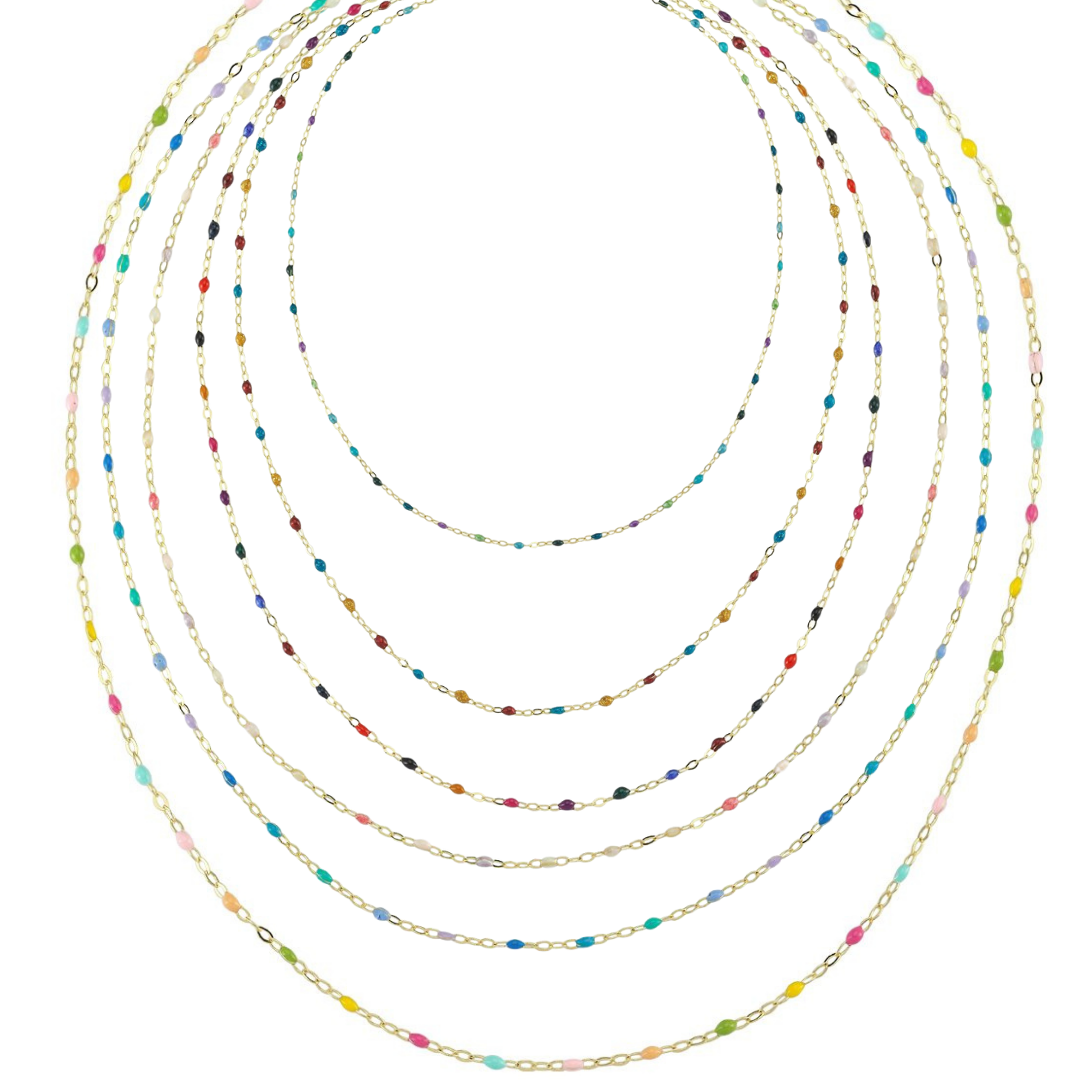 This stylish and distinctive style is the perfect way to add colour and chic to your mix. Choose a single colour or one of our mixes. We have created this design in 14ct gold using liquid resin that will stand the test of time in any conditions and will become a must have in nay necklace stack