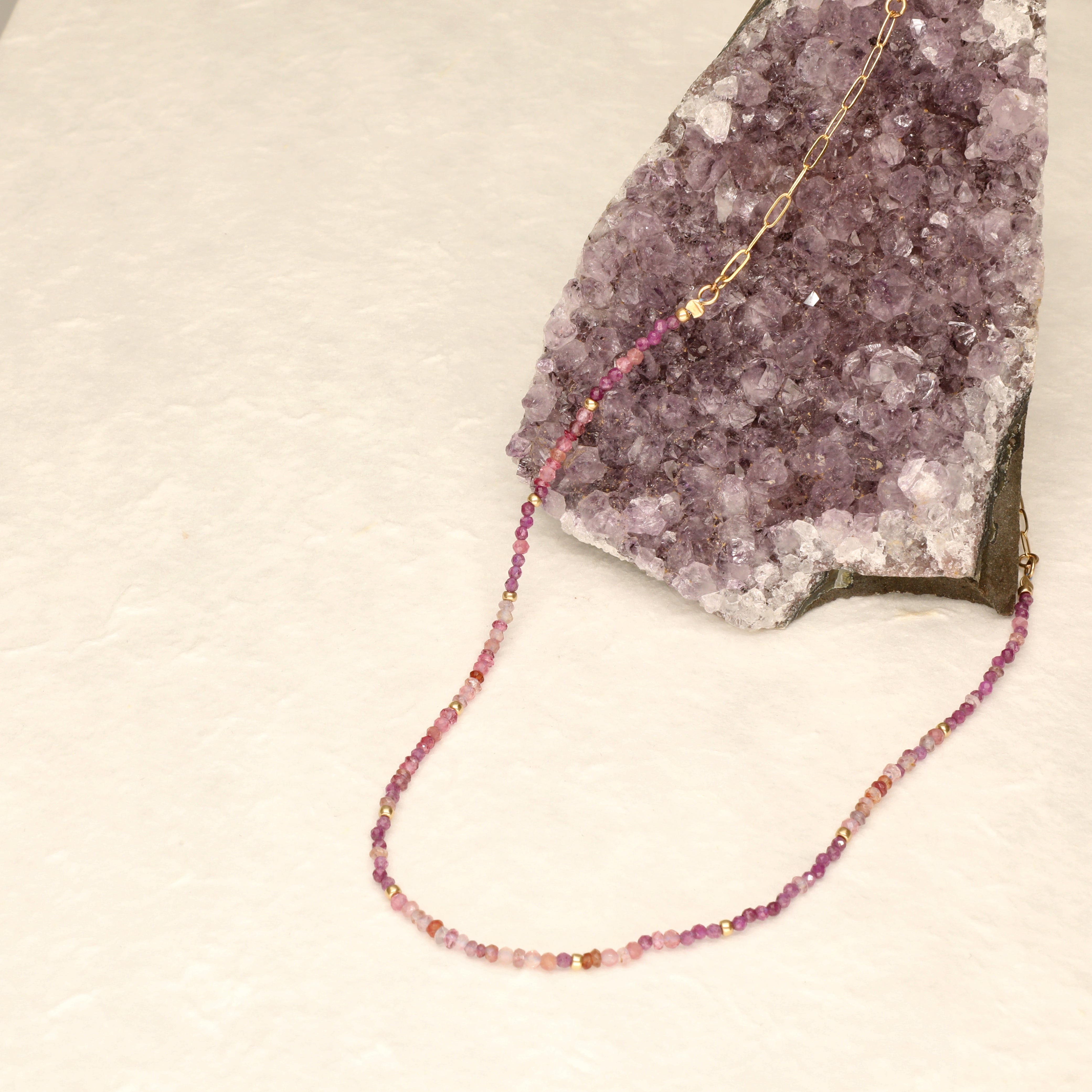 Rich red ruby tones delicately come together to create magical effec that will suit any skin tone.. Delicate hairpin chain detail creates interest with a slightly vintage feel. Wear with your little black dress, or more casually with a crisp white or sporty denim shirt to make this mix pop. Perfect to wear alone or layer up with your favourite gold or silver necklace stack. Hand selected semi precious stones highlight the intrinsic beauty of nature to create a stunning piece you will fall in love with. As modern as it is sophisticated.