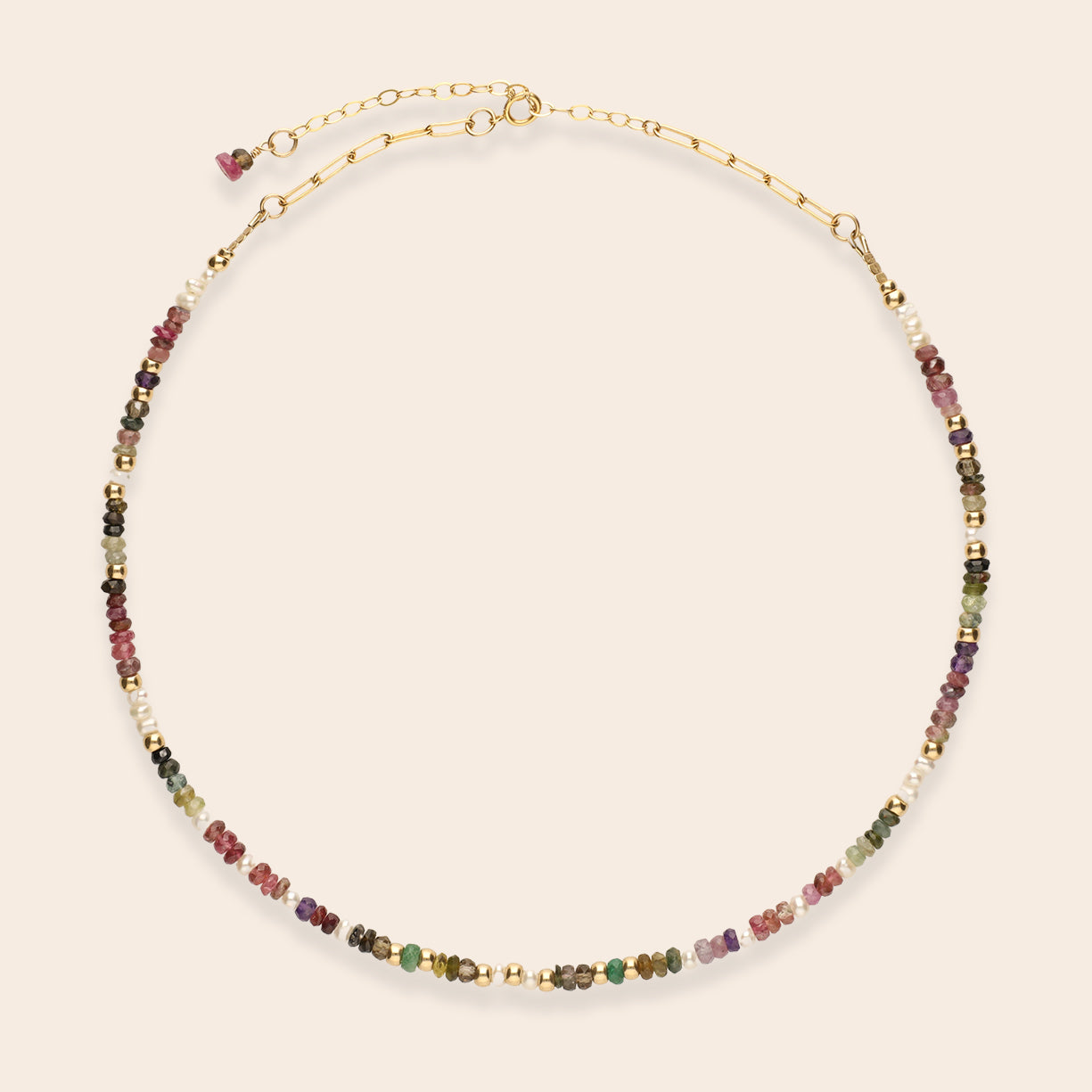 Rich jewel tones delicately balanced by the feminine lustre of pearls combine to create a magical mix that will suit any skin tone.. Wear with your little black dress, or more casually with a crisp white or sporty denim shirt to make this mix pop. Perfect to wear alone or layer up with your favourite gold or silver necklace stack. Hand selected semi precious stones highlight the intrinsic beauty of nature to create a stunning piece you will fall in love with. As modern as it is sophisticated. Love this rainbow mix