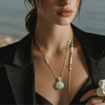 This season is all about long pendant necklaces, chunky coloured stones and fringe detailing. And coupled with ocean inspired mint green toned aquamarine, amazonite and tourmaline, this antique inspired chain is the perfect statement piece. Wear with a crisp white shirt or a black structured blazer for this seasons ultimate look
