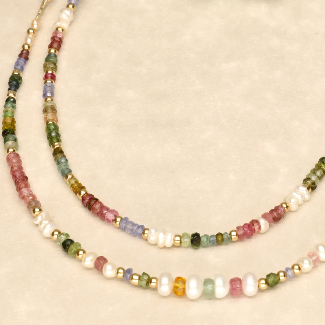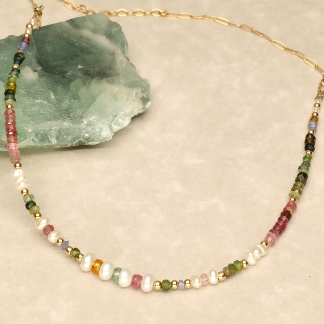 Bubblegum pastel tones of aquamarine tourmaline and tanzanite coupled with luminous pearls delicately arranged in ombre rainbow palettes create a sophisticated and feminine layering necklace. Perfect to wear alone or layer up with your favourite gold or silver necklace stack. Hand selected semi precious stones highlight the intrinsic beauty of nature to create a stunning piece you will fall in love with. As playful as it is sophisticated.