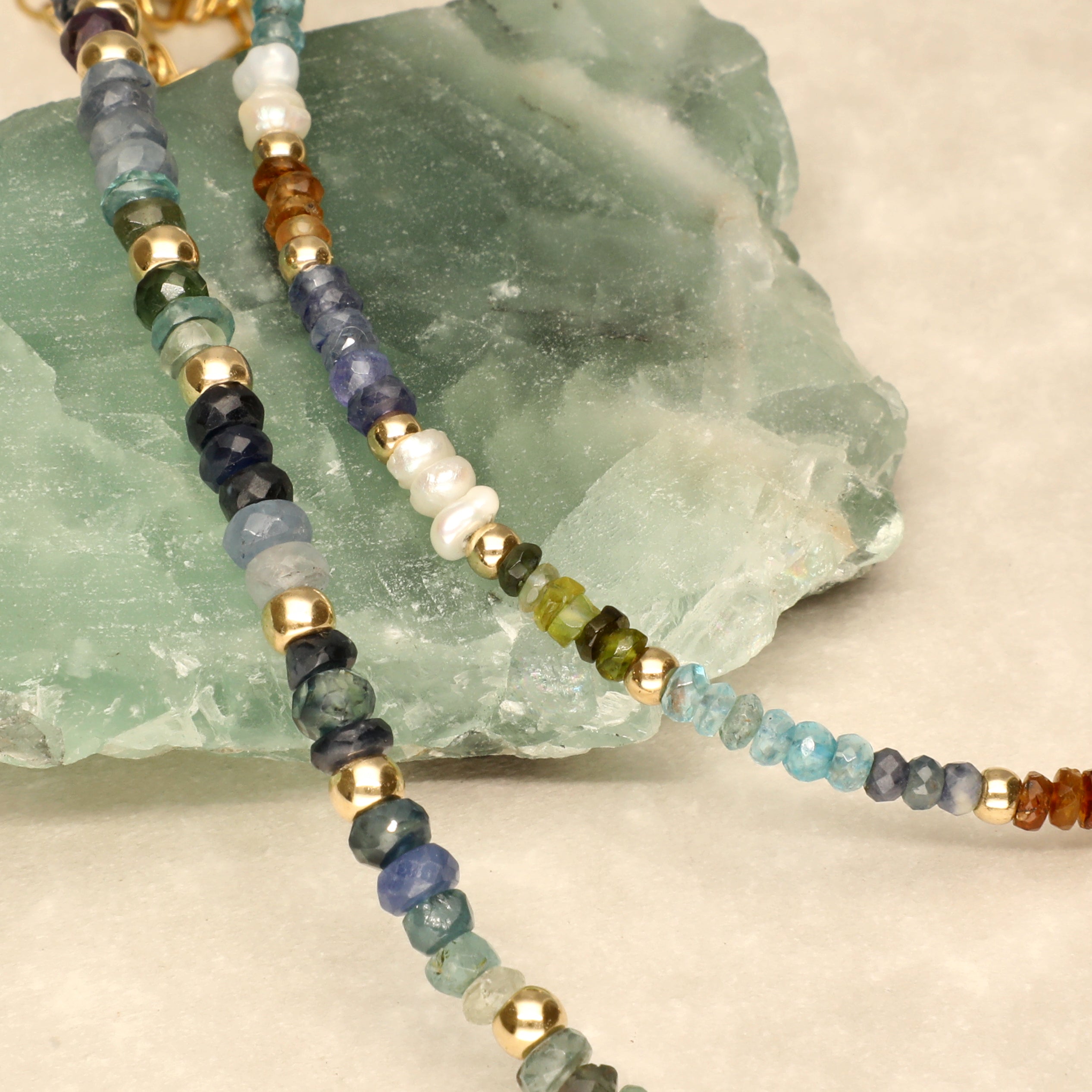 Desert browns combine with ocean blues to create a breathtaking yet serene palette. Perfect to wear alone or layer up with your favourite gold or silver necklace stack. Intricate pearl details combine with blue sapphire, aquamarine, and mixed brown tourmaline creating a stunning piece you wont want to take off