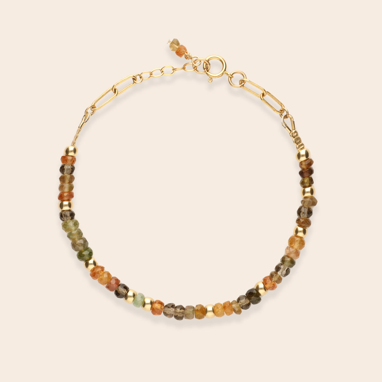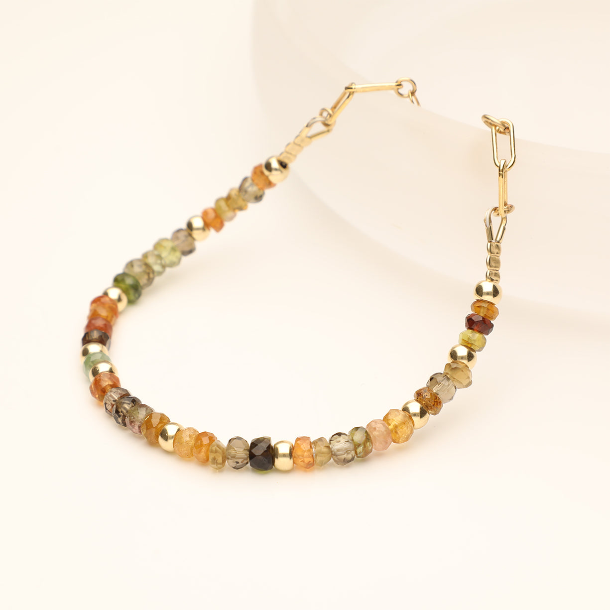 Rich and vibrant autumn tones come together to create magical mix that will suit any skin tone.. Chunky hairpin chain detail creates interest with a slightly vintage feel. Wear with your little black dress, or more casually with a crisp white or sporty denim shirt to make this mix pop. Perfect to wear alone or layer up with your favourite gold bracelet stack. Hand selected semi precious stones highlight the intrinsic beauty of nature to create a stunning piece you will fall in love with. As modern as it is sophisticated.