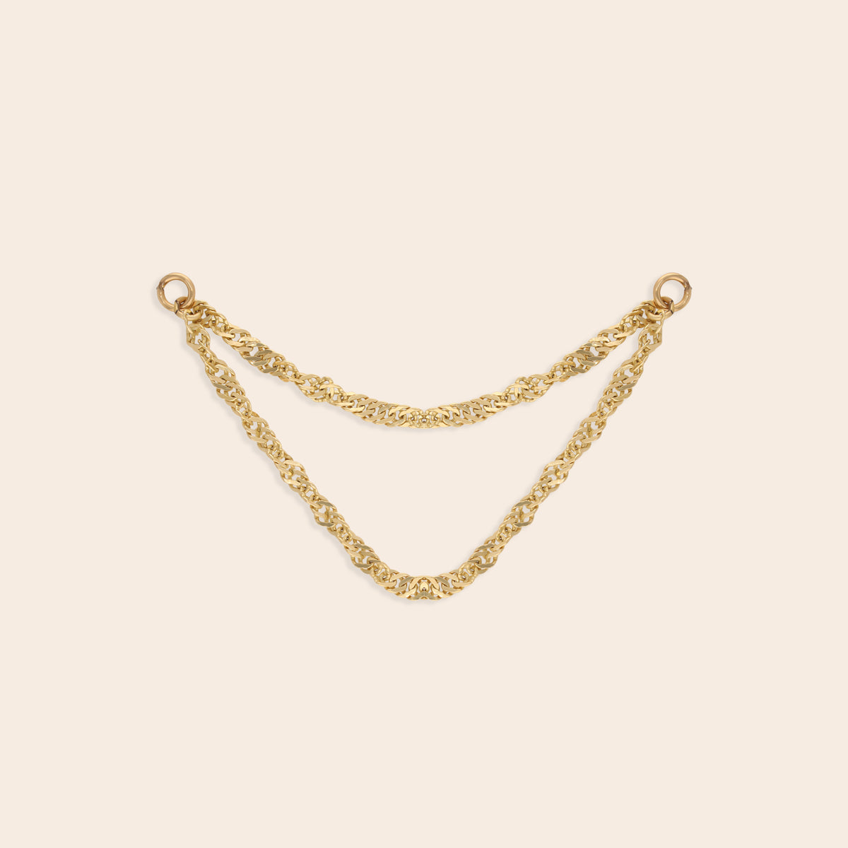 This little baby will turn and basic ear hoop or stud combination into a modern yet intricate drop earring. Just thread the loops onto two side by side lobe earrings or onto the front and back of an cartilage stud and watch the magic happen. This ornate singapore chain is the perfect detail to add a touch of sparkle to your ear party