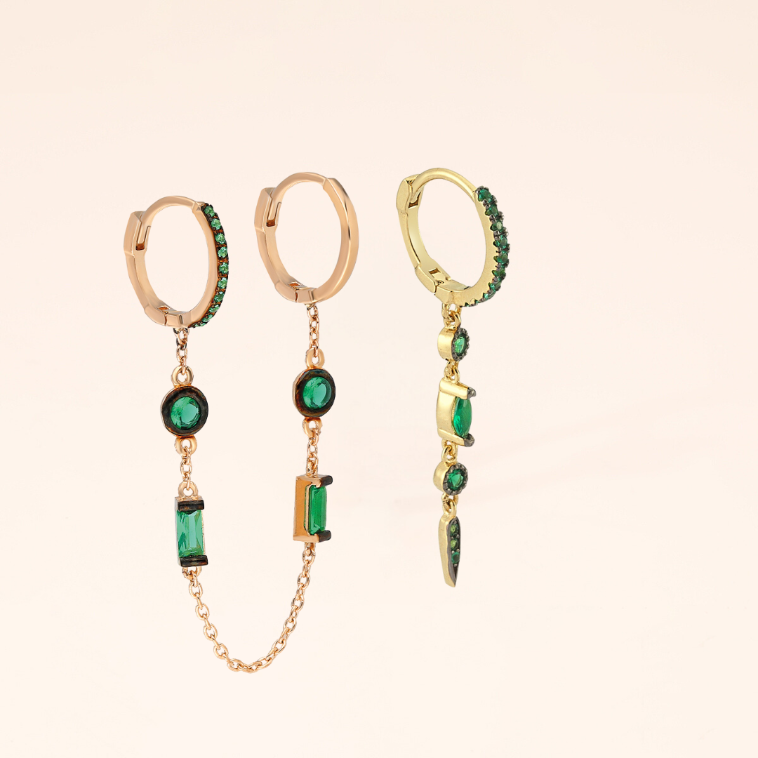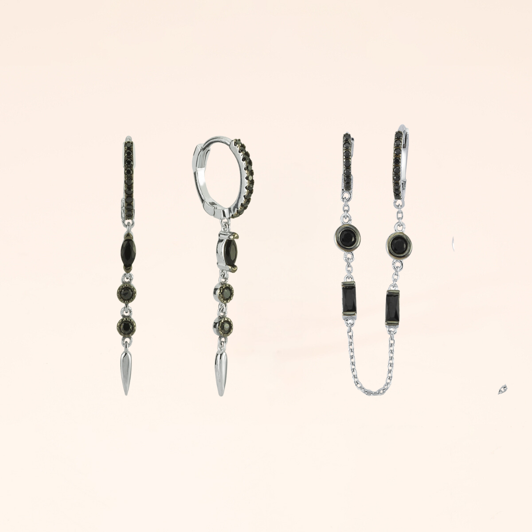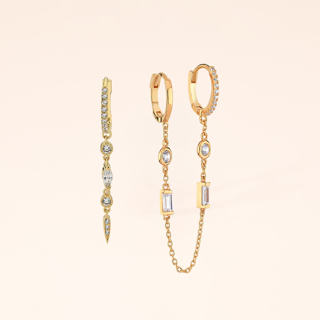 Set includes two earrings- one double earring for two lobe piercings and an additional single earring. Both can be worn on one ear for a modern asymmetrical look or one on each side for a more classic feel