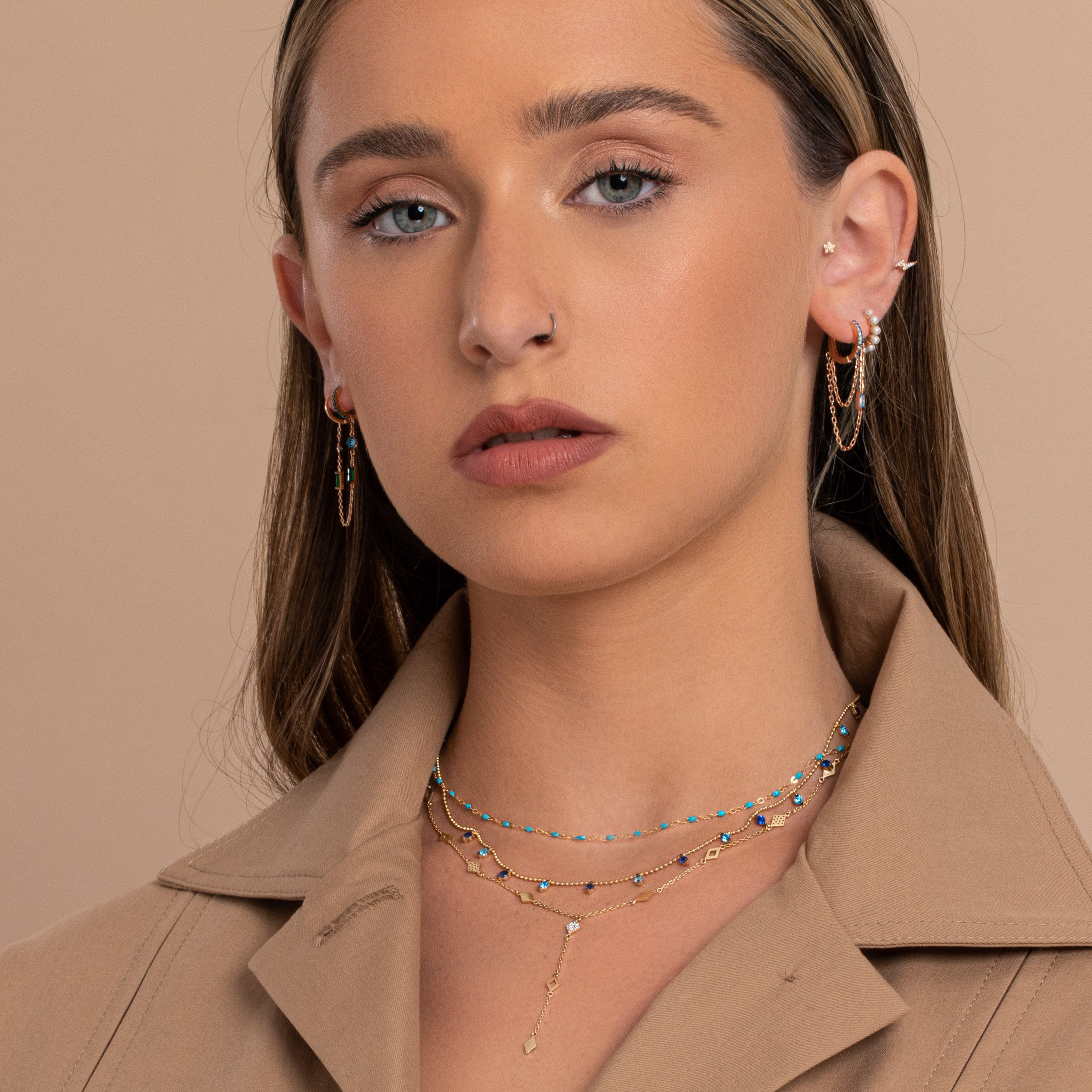 These light weight yet high impact ear hoops are the perfect way to add a real edge to any ear party. One of our best selling pieces we love them in any stone colour to add a touch of colour to your mix. Wear as a pair, double them up on one ear, or layer with others in the collection for a look that is timeless with a twist. Subtle stone embellishment adds glamour and real street style edge to any look. One of my all time real favorites