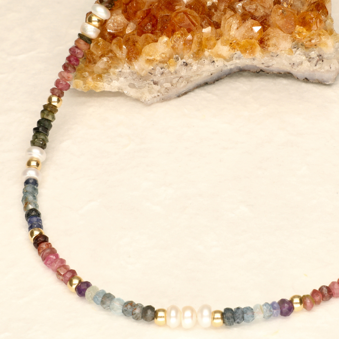 Rich jewel tones of smokey topaz and brown and pink tourmaline and aquamarine with the occasional green emerald scattered precisely between large button pearls and large gold filled beads create a sophisticated and feminine layering necklace. Perfect to wear alone or layer up with your favourite gold or silver necklace stack. Hand selected semi precious stones highlight the intrinsic beauty of nature to create a stunning piece you will fall in love with. As modern as it is sophisticated.