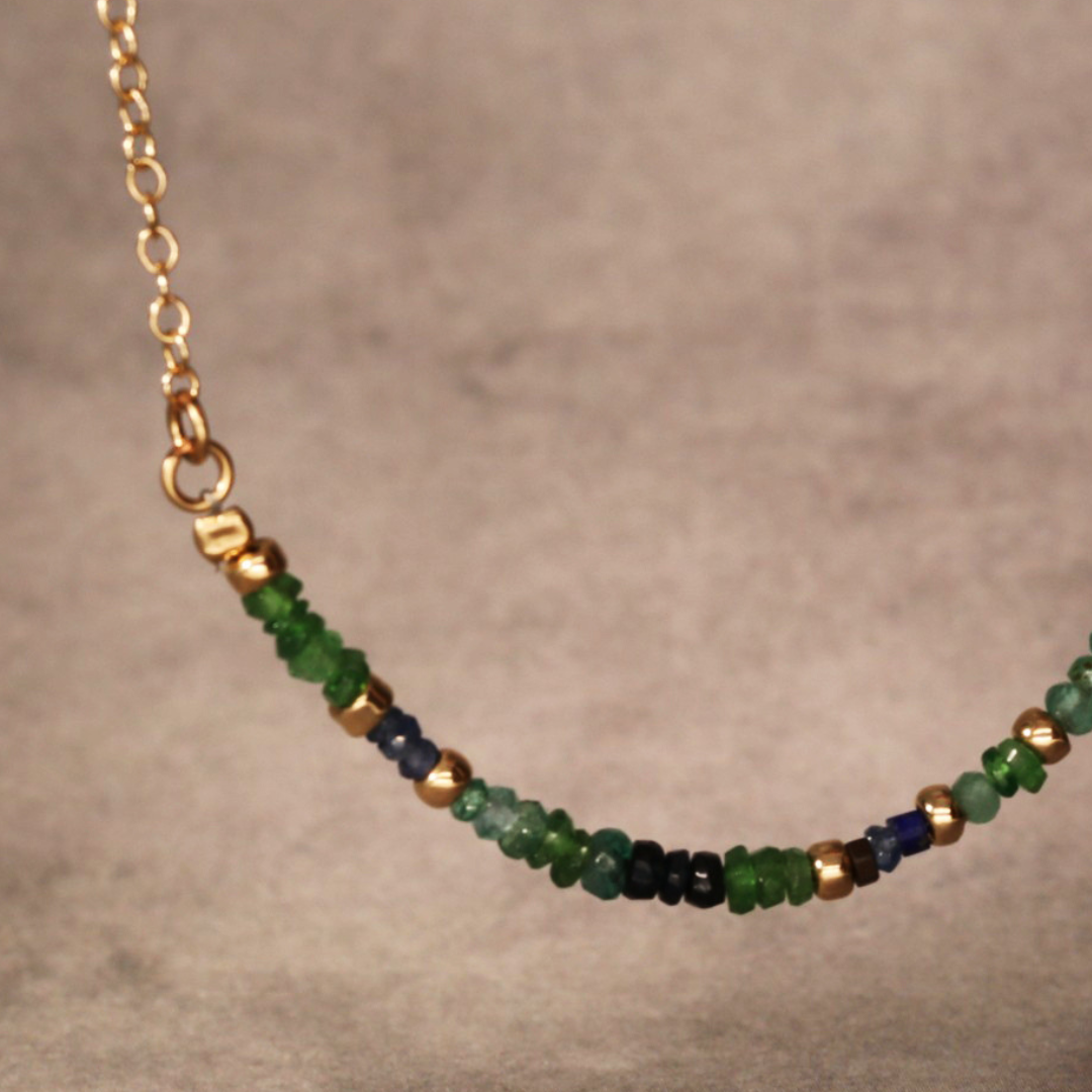 This intense blue green mix will work with layered with all your favourite gold styles or can be worn alone for a cleaner look. Perfect to wear with your classic white shirt or mixed with denim, emerald aquamarine and sapphires combine to create a timeless vibe that can be worn all year around. Delicate gold filled chain and bead detailing add a touch of glamour to the mix.