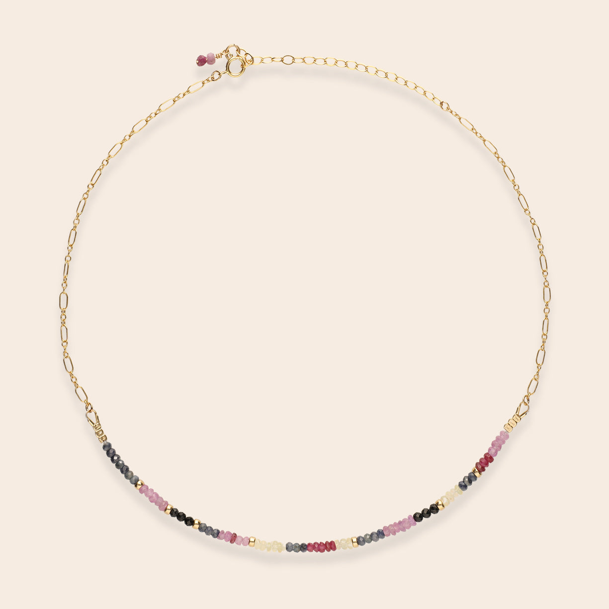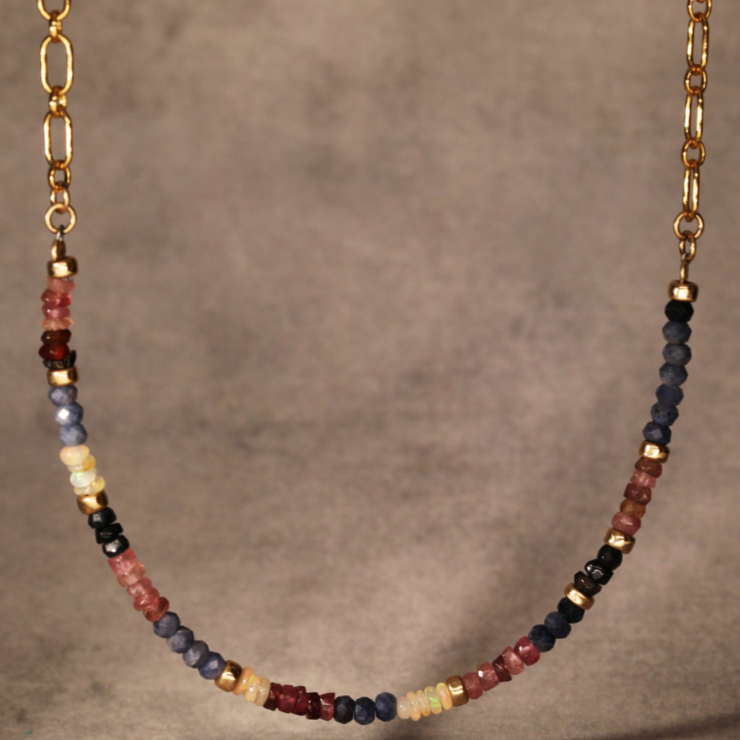 This unique color palette combines the beauty of sapphire ruby and opal to create a unique and feminine mix. Ideal to layer with all your favourite gold styles or wear alone for a cleaner look. Perfect to wear with your classic white shirt or mixed with denim for a timeless vibe that can be worn all year around. Delicate gold filled chain and bead detailing add a touch of glamour to the mix.