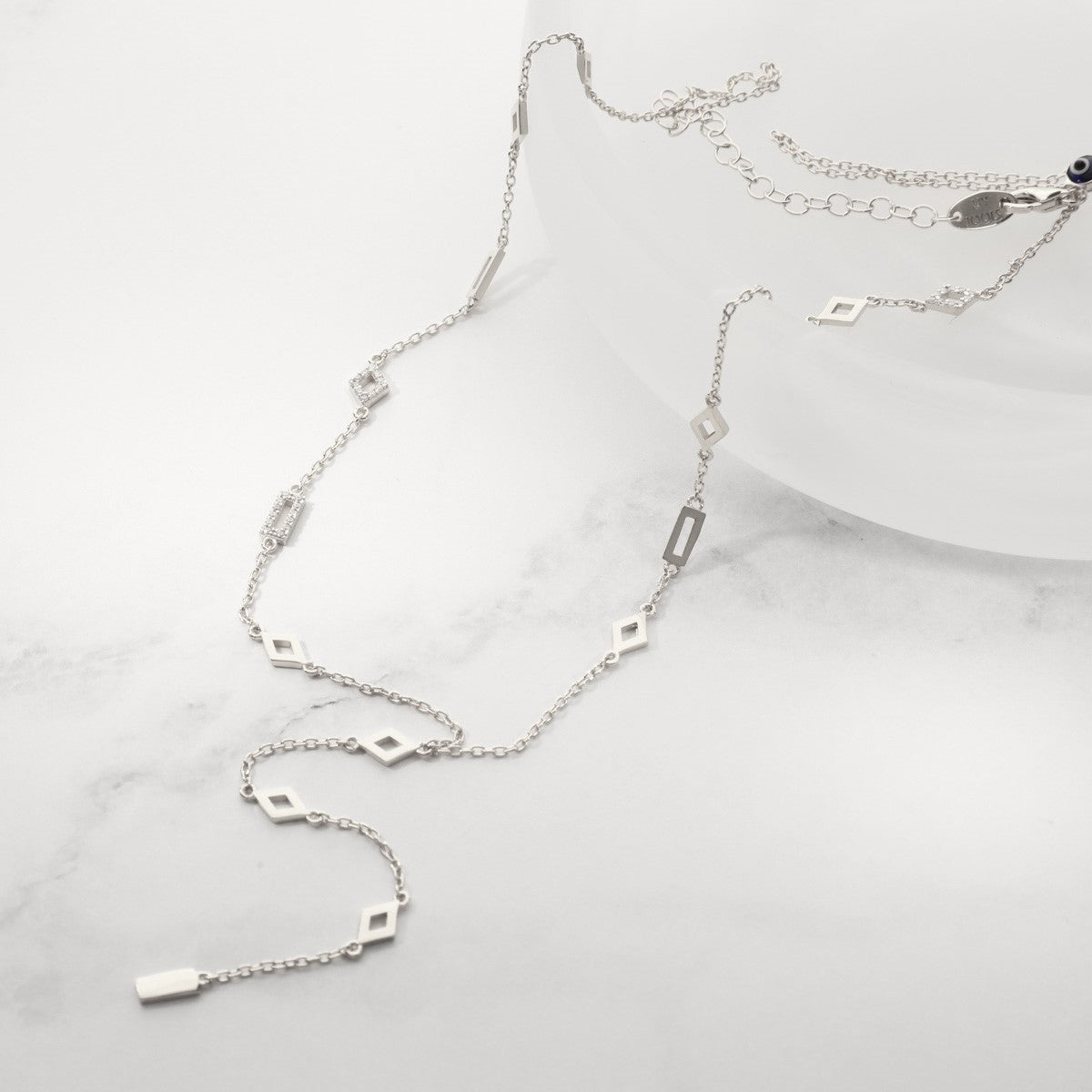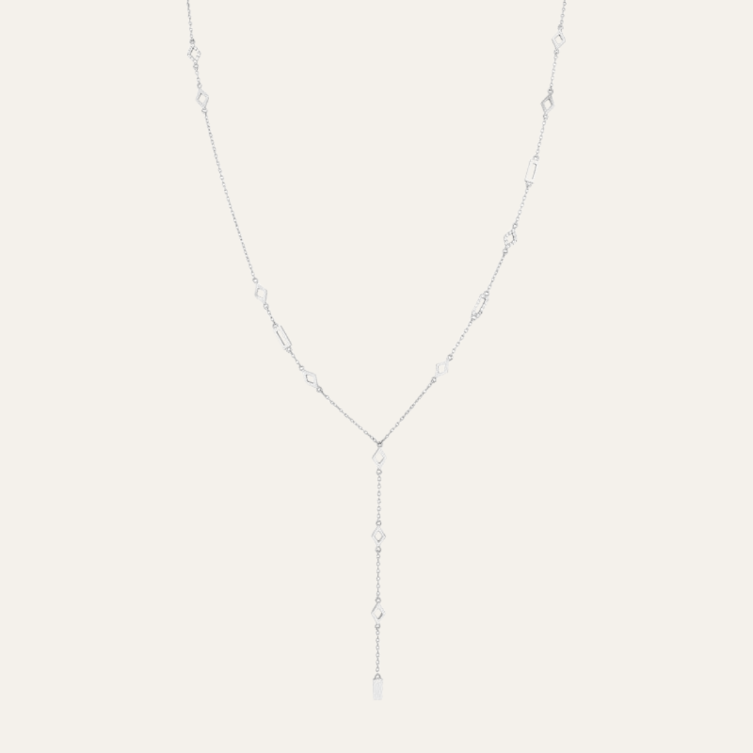 Featuring a mix of highly polished plain and pave stone embellished geometric shapes, this lariette is one of the cornerstone pieces of the collection. Sleek clean lines and elegantly crafted detail come together to create a look and style that is truly breathtaking. Wear alone or layer it up . With three length adjustments the options for how to wear this piece are limited only by your imagination.