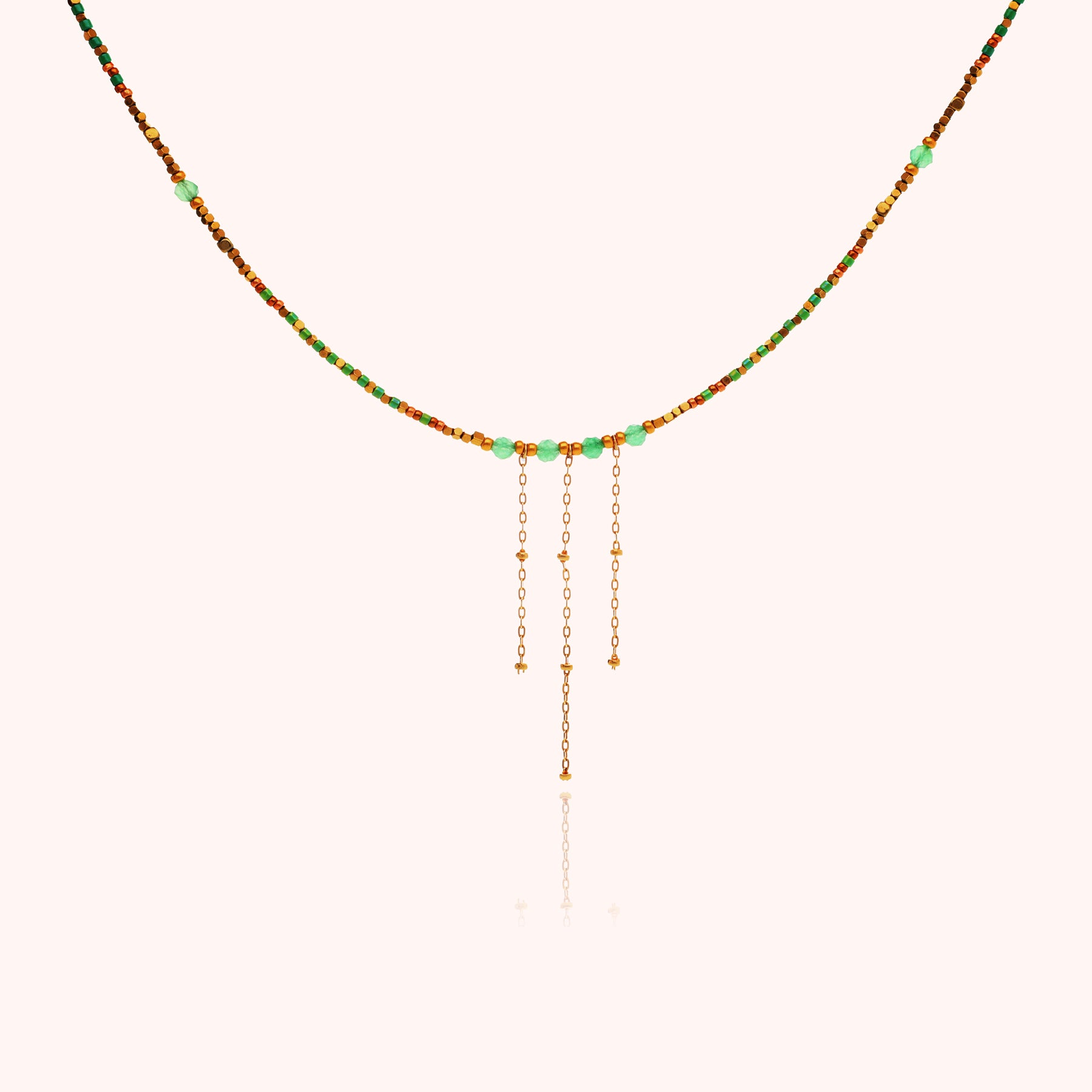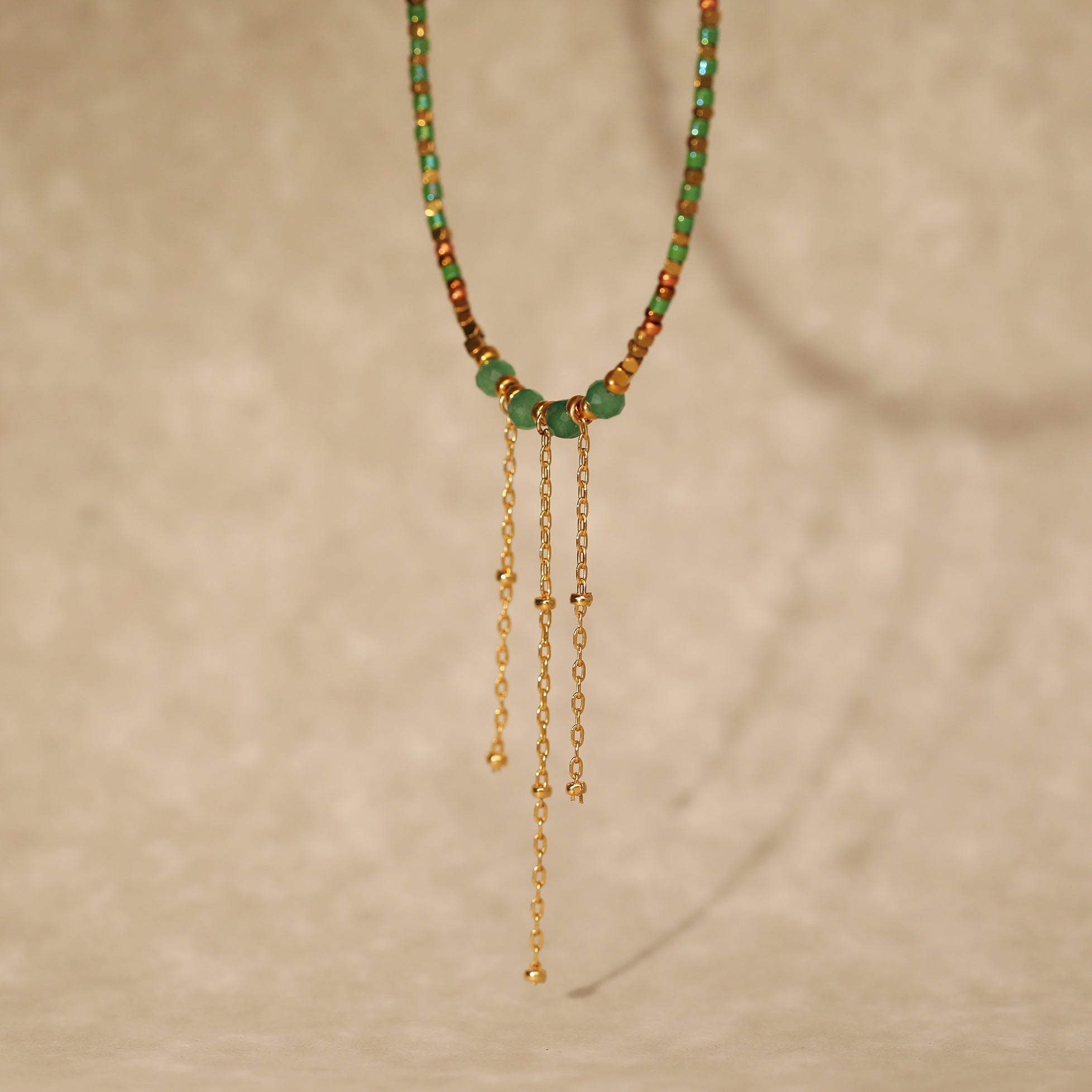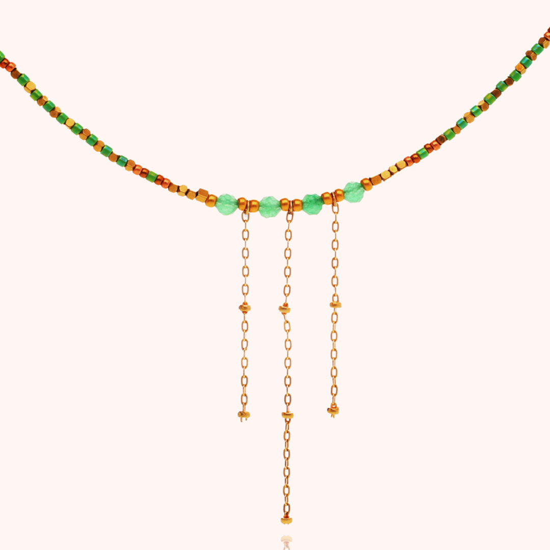 This modern and eye catching design features gold filled hanging tassels to add an extra touch of style and boho magic. Worn alone or as part of a stack as one of the longer length layers in the set, this design combines green garnet stones with green bronze and gold coloured miyuki beads. Perfect for any skin colouring, this stye adds just the right hint of colour.