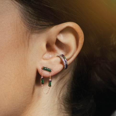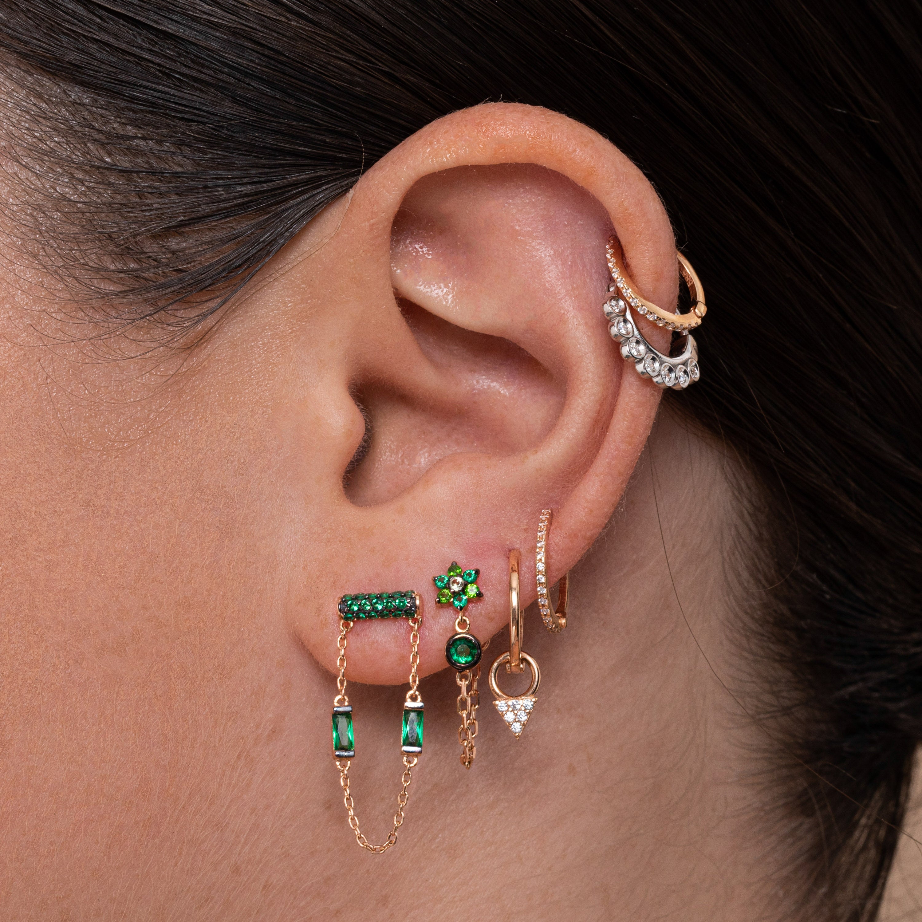 This delicate drop chain stud gives the look of a double piercing but with only one earring. Shorter than some of the other new earrings in the collection, this works worn alone or layered with other coordinating pieces and adds just the right amount of bling