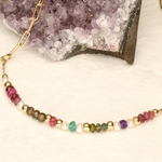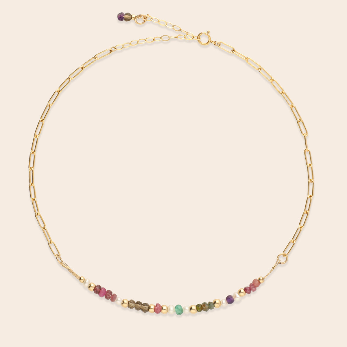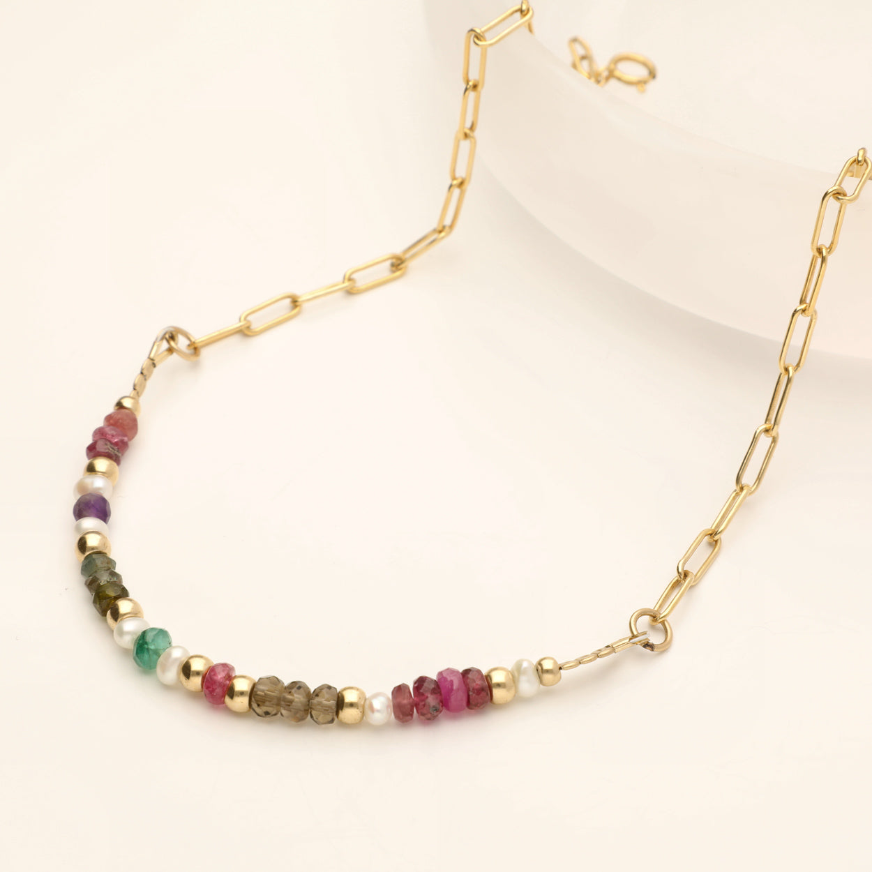 Rich jewel tones delicately come together to create magical mix that will suit any skin tone.. Chunky hairpin chain detail creates interest with a slightly vintage feel. Wear with your little black dress, or more casually with a crisp white or sporty denim shirt to make this mix pop. Perfect to wear alone or layer up with your favourite gold or silver necklace stack. Hand selected semi precious stones highlight the intrinsic beauty of nature to create a stunning piece you will fall in love with. As modern as it is sophisticated.