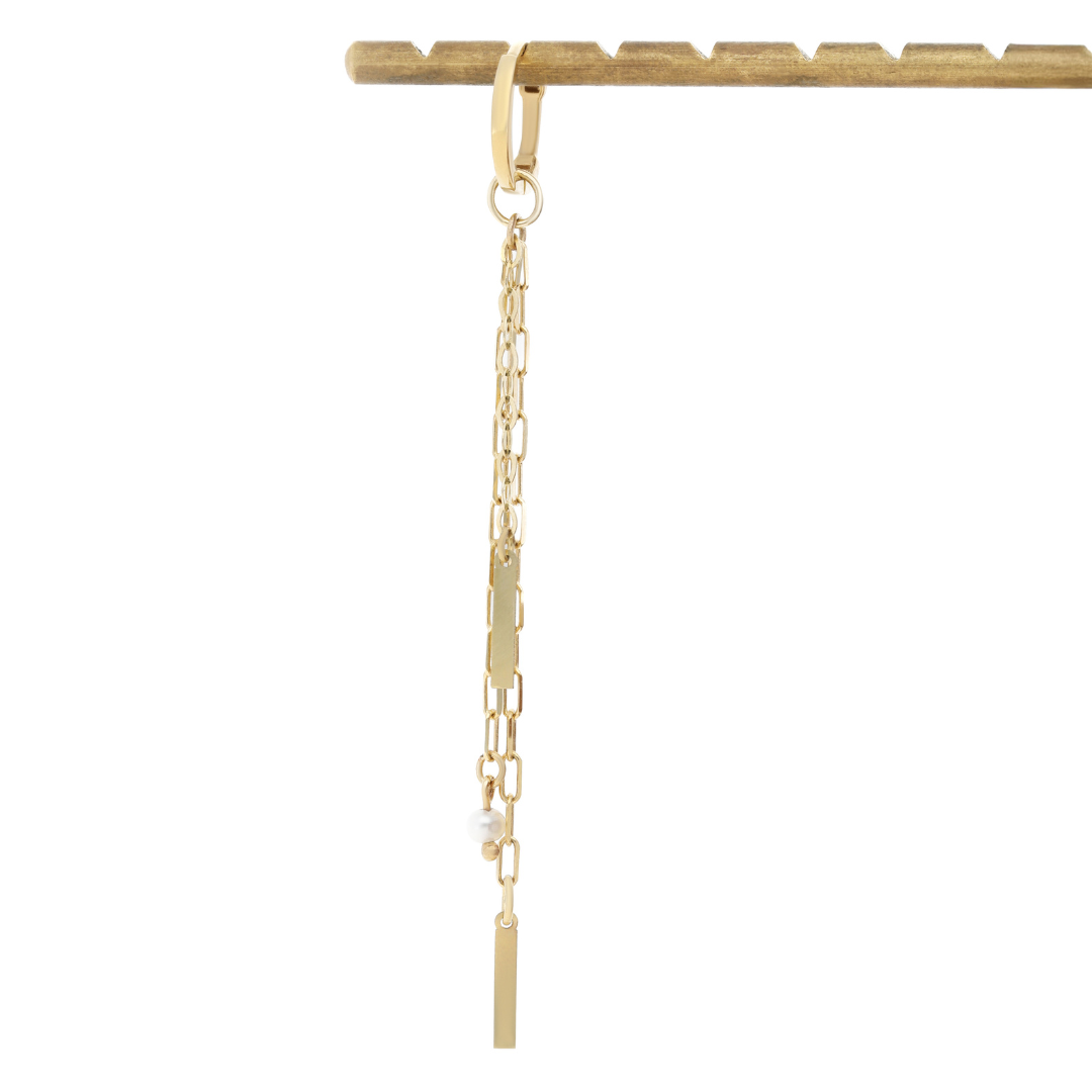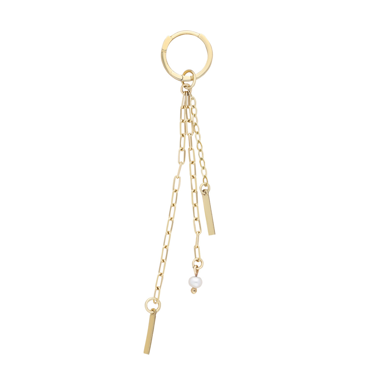 This little baby will turn a basic ear hoop or stud into a modern yet intricate drop earring. Just thread the loop onto a stud or hoop and watch the magic happen. This mix of chains with a feminine pearl finish are the perfect details to add a touch of sparkle to your ear party