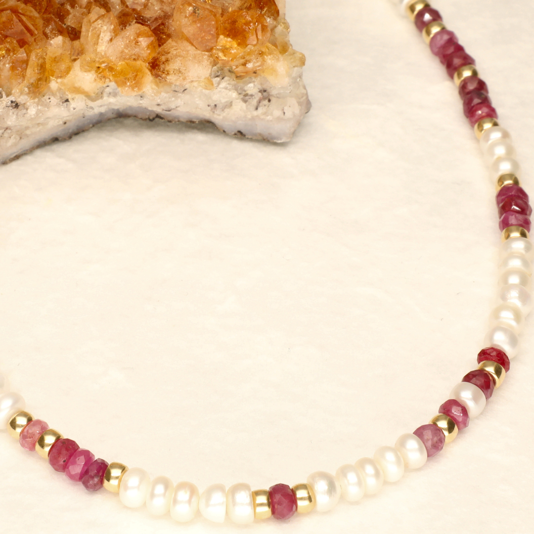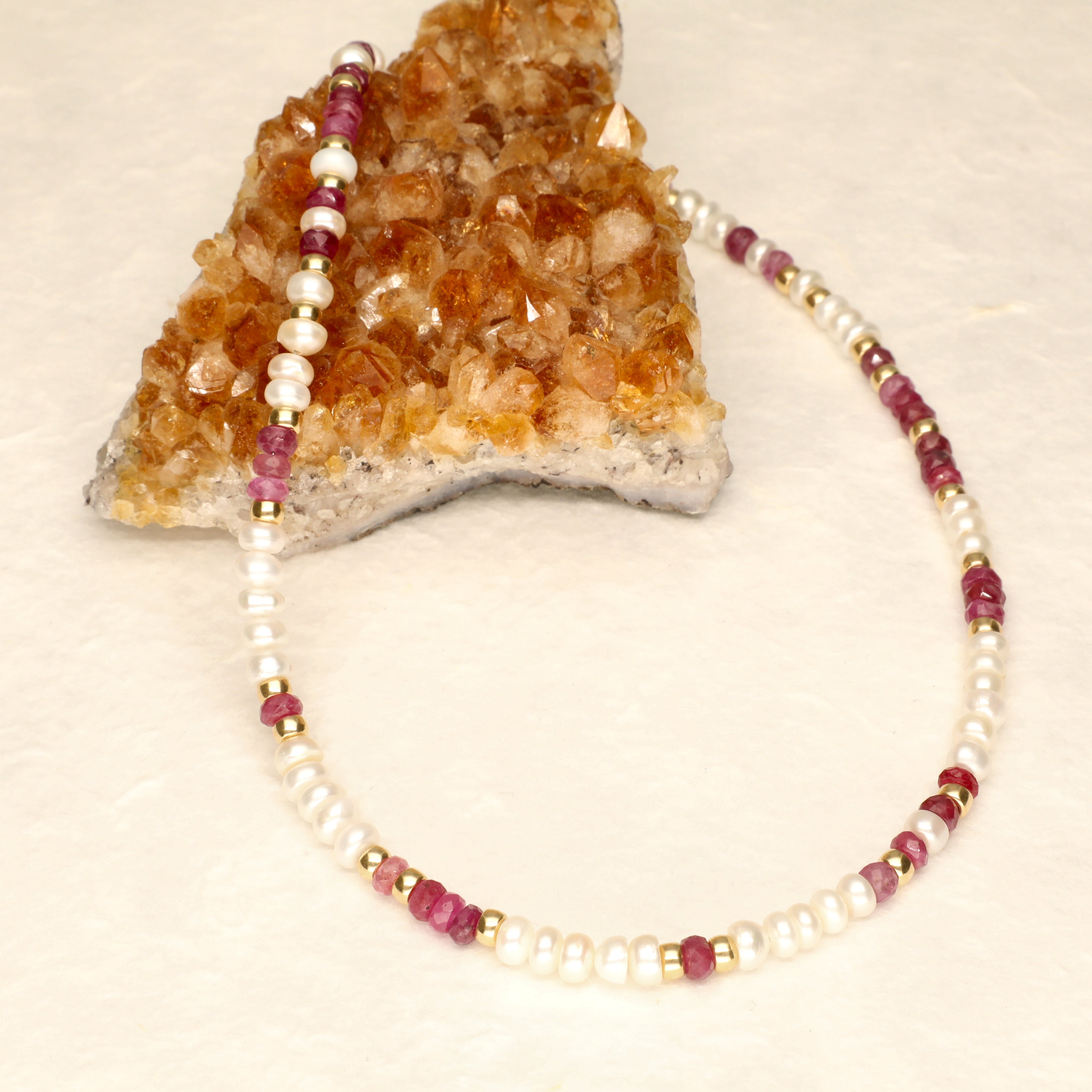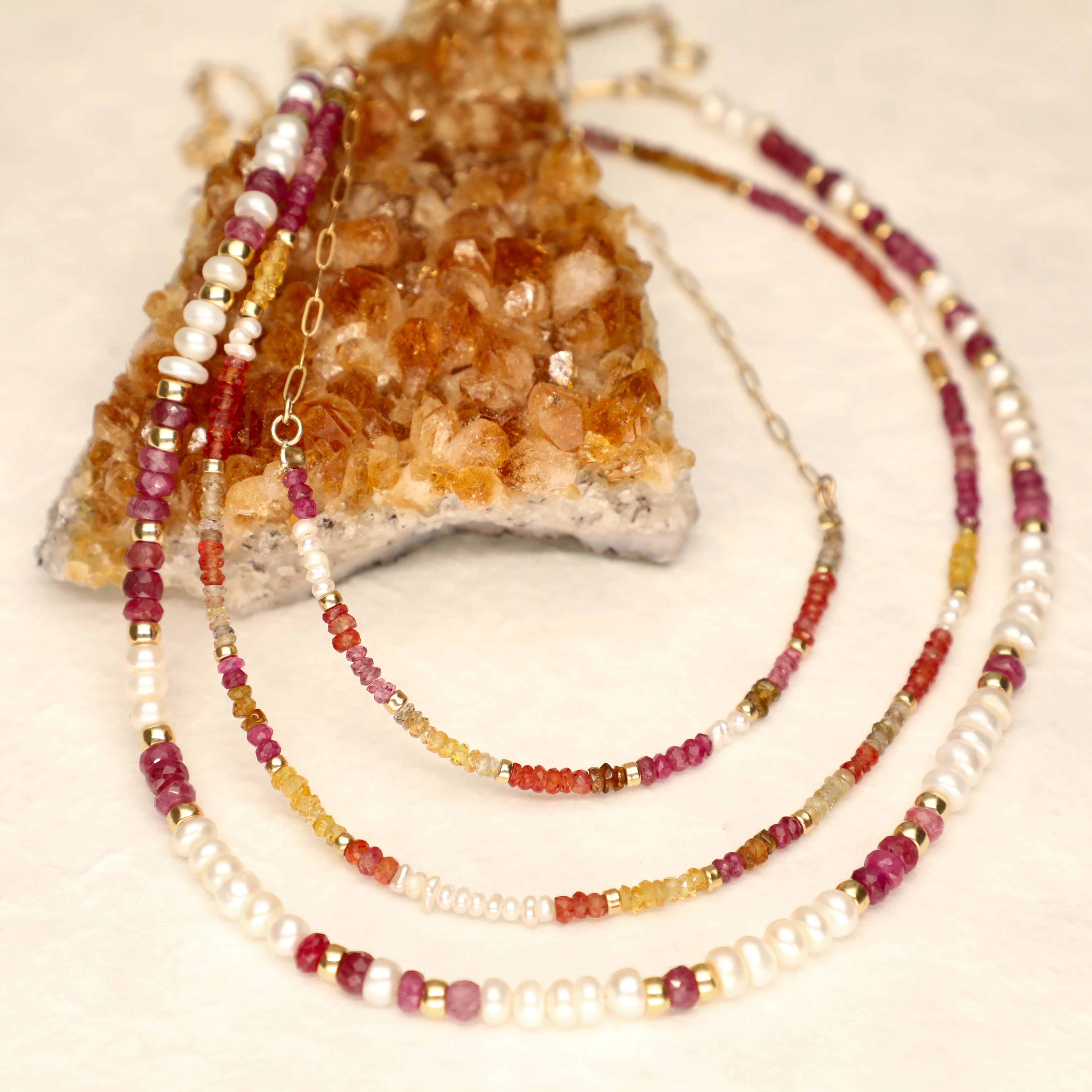 Hues of red and pink rubies and tourmalines scattered precisely between chunky button pearls to create a sophisticated and feminine layering necklace. Perfect to wear alone or layer up with your favourite gold or silver necklace stack. Hand selected semi precious stones in ombre mixes create a stunning piece you will fall in love with