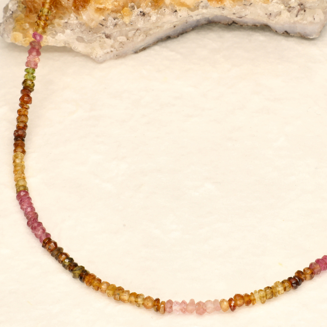 Tourmaline in dusty pinks greens and browns combine in this breathtaking yet delicate style. Feminine and perfectly proportioned, this style will suit any skin tones and every outfit. Perfect to wear alone or layer up with your favourite gold or silver necklace stack. Hand selected semi precious stones in ombre mixes create a stunning piece you will fall in love with. We love the sparkle of natural stone. Obsessed!